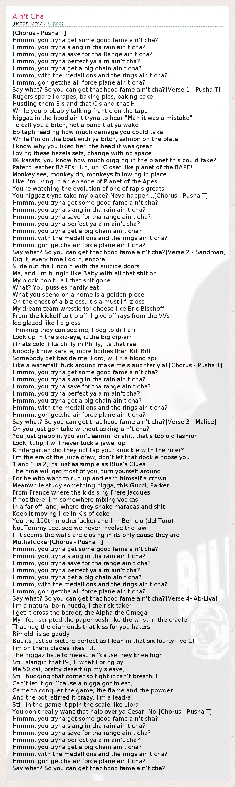 [Chorus - Pusha T] Hmmm, you tryna get some good fame ain't cha? Hmmm, you tryna slang in tha rain ain't cha? Hmmm, you tryna save for tha Range ain't cha? Hmmm, you tryna perfect ya aim ain't cha? Hmmm, you tryna get a big chain ain't cha? Hmmm, with the medallions and the rings ain't cha? Hmmm, gon getcha air force plane ain't cha? Say what? So you can get that hood fame ain't cha?[Verse 1 - Pusha T] Rugers spare I drapes, baking pies, baking cake Hustling them E's and that C's and that H While you probably talking frantic on the tape Niggaz in the hood ain't tryna to hear "Man it was a mistake" To call you a bitch, not a bandit at ya wake Epitaph reading how much damage you could take While I'm on the boat with ya bitch, salmon on the plate I know why you liked her, the head it was great Loving these bezels sets, change with no space 86 karats, you know how much digging in the planet this could take? Patent leather BAPEs...Uh, uh! Closet like planet of the BAPE! Monkey see, monkey do, monkeys following in place Like I'm living in an episode of Planet of the Apes You're watching the evolution of one of rap's greats You niggaz tryna take my place? Neva happen...[Chorus - Pusha T] Hmmm, you tryna get some good fame ain't cha? Hmmm, you tryna slang in tha rain ain't cha? Hmmm, you tryna save for tha range ain't cha? Hmmm, you tryna perfect ya aim ain't cha? Hmmm, you tryna get a big chain ain't cha? Hmmm, with the medallions and the rings ain't cha? Hmmm, gon getcha air force plane ain't cha? Say what? So you can get that hood fame ain't cha?[Verse 2 - Sandman] Dig it, every time I do it, encore Slide out tha Lincoln with tha suicide doors Ma, and I'm blingin like Baby with all that shit on My block pop til all that shit gone What? You pussies hardly eat What you spend on a home is a golden piece On the chest of a biz-oss, it's a must I fliz-oss My dream team wrestle for cheese like Eric Bischoff From the kickoff to tip off, I give off rays from the VVs Ice glazed like lip gloss Thinking they can see me, I beg to diff-arr Look up in the skiz-eye, it the big dip-arr (Thats cold!) Its chilly in Philly, its that real Nobody know karate, more bodies than Kill Bill Somebody get beside me, Lord, will his blood spill Like a waterfall, fuck around make me slaughter y'all[Chorus - Pusha T] Hmmm, you tryna get some good fame ain't cha? Hmmm, you tryna slang in tha rain ain't cha? Hmmm, you tryna save for tha range ain't cha? Hmmm, you tryna perfect ya aim ain't cha? Hmmm, you tryna get a big chain ain't cha? Hmmm, with the medallions and the rings ain't cha? Hmmm, gon getcha air force plane ain't cha? Say what? So you can get that hood fame ain't cha?[Verse 3 - Malice] Oh you just gon take without asking ain't cha? You just grabbin, you ain't earnin for shit, that's too old fashion Look, tulip, I will never tuck a jewel up Kindergarten did they not tap your knuckle with the ruler? I'm the era of the juice crew, don't let that dookie noose you 1 and 1 is 2, its just as simple as Blue's Clues The nine will get most of you, turn yourself around For he who want to run up and earn himself a crown Meanwhile study something nigga, this Gucci, Parker From France where the kids sing Frere Jacques If not there, I'm somewhere mixing vodkas In a far off land, where they shake maracas and shit Keep it moving like in KIs of coke You the 100th motherfucker and I'm Benicio (del Toro) Not Tommy Lee, see we never involve the law If it seems the walls are closing in its only cause they are Muthafucker[Chorus - Pusha T] Hmmm, you tryna get some good fame ain't cha? Hmmm, you tryna slang in tha rain ain't cha? Hmmm, you tryna save for tha range ain't cha? Hmmm, you tryna perfect ya aim ain't cha? Hmmm, you tryna get a big chain ain't cha? Hmmm, with the medallions and the rings ain't cha? Hmmm, gon getcha air force plane ain't cha? Say what? So you can get that hood fame ain't cha?[Verse 4- Ab-Liva] I'm a natural born hustla, I the risk taker I get it cross the border, the Alpha the Omega My life, I scripted the paper posh like the wrist in the cradle That hug the diamonds that kiss for you haters Rimoldi is so gaudy But its just so picture-perfect as I lean in that six fourty-five CI I'm on them blades likes T.I. The niggaz hate to measure ''cause they knee high Still slangin that P-I, E what I bring by Me 50 cal, pretty desert up my sleave, I Still hugging that corner so tight it can't breath, I Can't let it go, ''cause a nigga got to eat, I Came to conquer the game, the flame and the powder And the pot, stirred it crazy, I'm a lead-a Still in the game, tippin the scale like Libra You don't really want that halo over ya Cesar! No![Chorus - Pusha T] Hmmm, you tryna get some good fame ain't cha? Hmmm, you tryna slang in tha rain ain't cha? Hmmm, you tryna save for tha range ain't cha? Hmmm, you tryna perfect ya aim ain't cha? Hmmm, you tryna get a big chain ain't cha? Hmmm, with the medallions and the rings ain't cha? Hmmm, gon getcha air force plane ain't cha? Say what? So you can get that hood fame ain't cha?