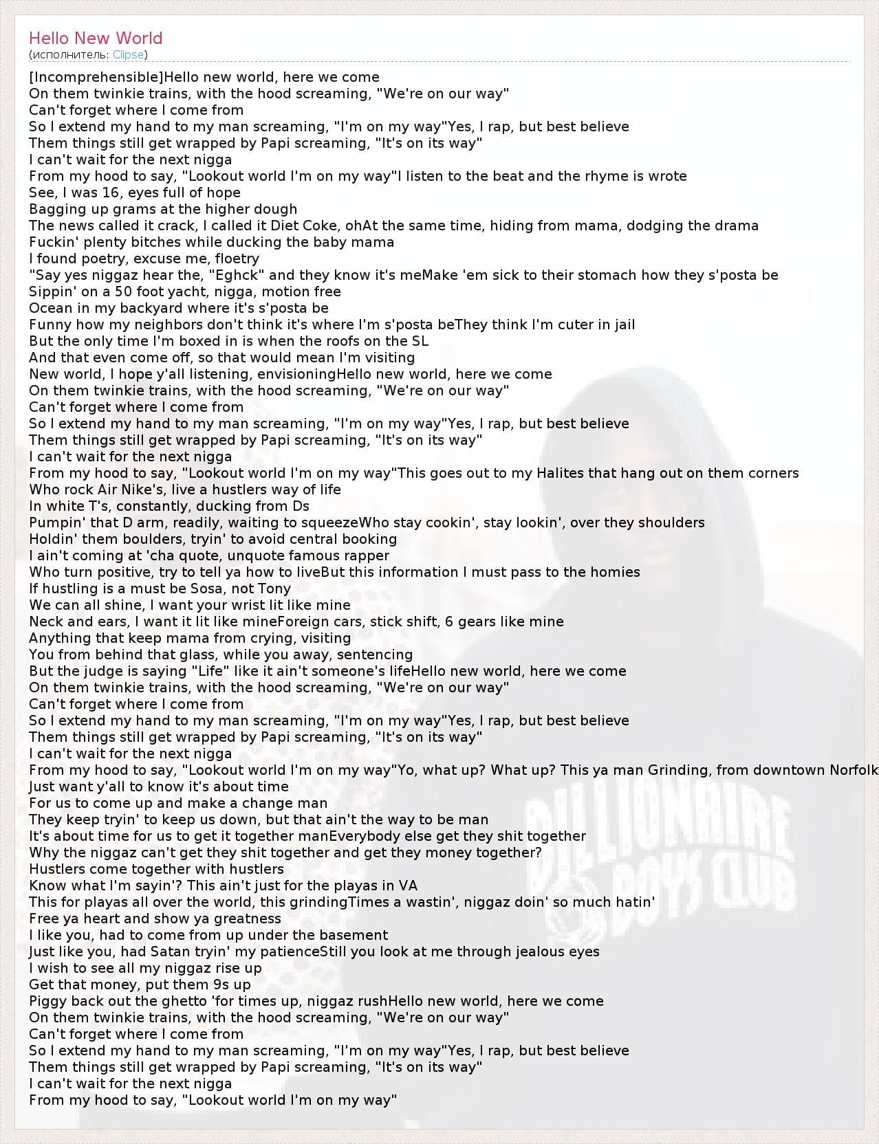 [Incomprehensible]Hello new world, here we come On them twinkie trains, with the hood screaming, "We're on our way" Can't forget where I come from So I extend my hand to my man screaming, "I'm on my way"Yes, I rap, but best believe Them things still get wrapped by Papi screaming, "It's on its way" I can't wait for the next nigga From my hood to say, "Lookout world I'm on my way"I listen to the beat and the rhyme is wrote See, I was 16, eyes full of hope Bagging up grams at the higher dough The news called it crack, I called it Diet Coke, ohAt the same time, hiding from mama, dodging the drama Fuckin' plenty bitches while ducking the baby mama I found poetry, excuse me, floetry "Say yes niggaz hear the, "Eghck" and they know it's meMake 'em sick to their stomach how they s'posta be Sippin' on a 50 foot yacht, nigga, motion free Ocean in my backyard where it's s'posta be Funny how my neighbors don't think it's where I'm s'posta beThey think I'm cuter in jail But the only time I'm boxed in is when the roofs on the SL And that even come off, so that would mean I'm visiting New world, I hope y'all listening, envisioningHello new world, here we come On them twinkie trains, with the hood screaming, "We're on our way" Can't forget where I come from So I extend my hand to my man screaming, "I'm on my way"Yes, I rap, but best believe Them things still get wrapped by Papi screaming, "It's on its way" I can't wait for the next nigga From my hood to say, "Lookout world I'm on my way"This goes out to my Halites that hang out on them corners Who rock Air Nike's, live a hustlers way of life In white T's, constantly, ducking from Ds Pumpin' that D arm, readily, waiting to squeezeWho stay cookin', stay lookin', over they shoulders Holdin' them boulders, tryin' to avoid central booking I ain't coming at 'cha quote, unquote famous rapper Who turn positive, try to tell ya how to liveBut this information I must pass to the homies If hustling is a must be Sosa, not Tony We can all shine, I want your wrist lit like mine Neck and ears, I want it lit like mineForeign cars, stick shift, 6 gears like mine Anything that keep mama from crying, visiting You from behind that glass, while you away, sentencing But the judge is saying "Life" like it ain't someone's lifeHello new world, here we come On them twinkie trains, with the hood screaming, "We're on our way" Can't forget where I come from So I extend my hand to my man screaming, "I'm on my way"Yes, I rap, but best believe Them things still get wrapped by Papi screaming, "It's on its way" I can't wait for the next nigga From my hood to say, "Lookout world I'm on my way"Yo, what up? What up? This ya man Grinding, from downtown Norfolk Just want y'all to know it's about time For us to come up and make a change man They keep tryin' to keep us down, but that ain't the way to be man It's about time for us to get it together manEverybody else get they shit together Why the niggaz can't get they shit together and get they money together? Hustlers come together with hustlers Know what I'm sayin'? This ain't just for the playas in VA This for playas all over the world, this grindingTimes a wastin', niggaz doin' so much hatin' Free ya heart and show ya greatness I like you, had to come from up under the basement Just like you, had Satan tryin' my patienceStill you look at me through jealous eyes I wish to see all my niggaz rise up Get that money, put them 9s up Piggy back out the ghetto 'for times up, niggaz rushHello new world, here we come On them twinkie trains, with the hood screaming, "We're on our way" Can't forget where I come from So I extend my hand to my man screaming, "I'm on my way"Yes, I rap, but best believe Them things still get wrapped by Papi screaming, "It's on its way" I can't wait for the next nigga From my hood to say, "Lookout world I'm on my way"