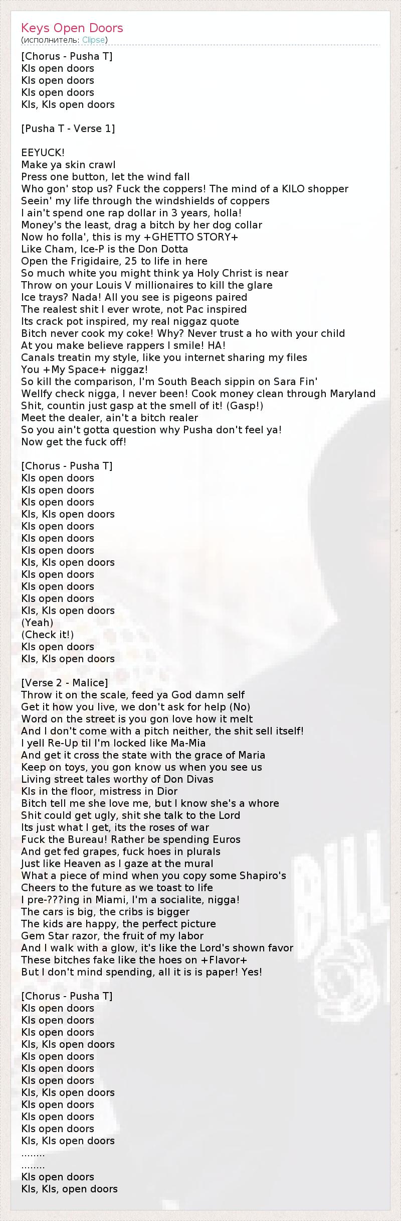 [Chorus - Pusha T] KIs open doors KIs open doors KIs open doors KIs, KIs open doors [Pusha T - Verse 1] EEYUCK! Make ya skin crawl Press one button, let the wind fall Who gon' stop us? Fuck the coppers! The mind of a KILO shopper Seein' my life through the windshields of coppers I ain't spend one rap dollar in 3 years, holla! Money's the least, drag a bitch by her dog collar Now ho folla', this is my +GHETTO STORY+ Like Cham, Ice-P is the Don Dotta Open the Frigidaire, 25 to life in here So much white you might think ya Holy Christ is near Throw on your Louis V millionaires to kill the glare Ice trays? Nada! All you see is pigeons paired The realest shit I ever wrote, not Pac inspired Its crack pot inspired, my real niggaz quote Bitch never cook my coke! Why? Never trust a ho with your child At you make believe rappers I smile! HA! Canals treatin my style, like you internet sharing my files You +My Space+ niggaz! So kill the comparison, I'm South Beach sippin on Sara Fin' Wellfy check nigga, I never been! Cook money clean through Maryland Shit, countin just gasp at the smell of it! (Gasp!) Meet the dealer, ain't a bitch realer So you ain't gotta question why Pusha don't feel ya! Now get the fuck off! [Chorus - Pusha T] KIs open doors KIs open doors KIs open doors KIs, KIs open doors KIs open doors KIs open doors KIs open doors KIs, KIs open doors KIs open doors KIs open doors KIs open doors KIs, KIs open doors (Yeah) (Check it!) KIs open doors KIs, KIs open doors [Verse 2 - Malice] Throw it on the scale, feed ya God damn self Get it how you live, we don't ask for help (No) Word on the street is you gon love how it melt And I don't come with a pitch neither, the shit sell itself! I yell Re-Up til I'm locked like Ma-Mia And get it cross the state with the grace of Maria Keep on toys, you gon know us when you see us Living street tales worthy of Don Divas KIs in the floor, mistress in Dior Bitch tell me she love me, but I know she's a whore Shit could get ugly, shit she talk to the Lord Its just what I get, its the roses of war Fuck the Bureau! Rather be spending Euros And get fed grapes, fuck hoes in plurals Just like Heaven as I gaze at the mural What a piece of mind when you copy some Shapiro's Cheers to the future as we toast to life I pre-???ing in Miami, I'm a socialite, nigga! The cars is big, the cribs is bigger The kids are happy, the perfect picture Gem Star razor, the fruit of my labor And I walk with a glow, it's like the Lord's shown favor These bitches fake like the hoes on +Flavor+ But I don't mind spending, all it is is paper! Yes! [Chorus - Pusha T] KIs open doors KIs open doors KIs open doors KIs, KIs open doors KIs open doors KIs open doors KIs open doors KIs, KIs open doors KIs open doors KIs open doors KIs open doors KIs, KIs open doors ........ ........ KIs open doors KIs, KIs, open doors