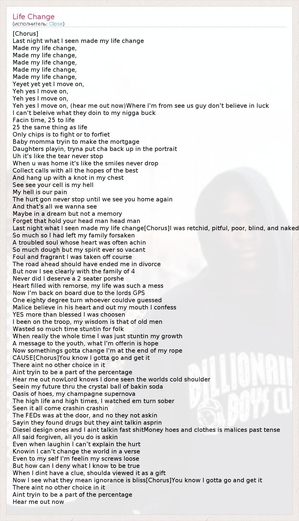 [Chorus] Last night what I seen made my life change Made my life change, Made my life change, Made my life change, Made my life change, Made my life change, Yeyet yet yet I move on, Yeh yes I move on, Yeh yes I move on, Yeh yes I move on, (hear me out now)Where I'm from see us guy don't believe in luck I can't beleive what they doin to my nigga buck Facin time, 25 to life 25 the same thing as life Only chips is to fight or to forfiet Baby momma tryin to make the mortgage Daughters playin, tryna put cha back up in the portrait Uh it's like the tear never stop When u was home it's like the smiles never drop Collect calls with all the hopes of the best And hang up with a knot in my chest See see your cell is my hell My hell is our pain The hurt gon never stop until we see you home again And that's all we wanna see Maybe in a dream but not a memory Forget that hold your head man head man Last night what I seen made my life change[Chorus]I was retchid, pitful, poor, blind, and naked So much so I had left my family forsaken A troubled soul whose heart was often achin So much dough but my spirit ever so vacant Foul and fragrant I was taken off course The road ahead should have ended me in divorce But now I see clearly with the family of 4 Never did I deserve a 2 seater porshe Heart filled with remorse, my life was such a mess Now I'm back on board due to the lords GPS One eighty degree turn whoever couldve guessed Malice believe in his heart and out my mouth I confess YES more than blessed I was choosen I been on the troop, my wisdom is that of old men Wasted so much time stuntin for folk When really the whole time I was just stuntin my growth A message to the youth, what I'm offerin is hope Now somethings gotta change I'm at the end of my rope CAUSE[Chorus]You know I gotta go and get it There aint no other choice in it Aint tryin to be a part of the percentage Hear me out nowLord knows I done seen the worlds cold shoulder Seein my future thru the crystal ball of bakin soda Oasis of hoes, my champagne supernova The high life and high times, I watched em turn sober Seen it all come crashin crashin The FEDs was at the door, and no they not askin Sayin they found drugs but they aint talkin asprin Diesel design ones and I aint talkin fast shitMoney hoes and clothes is malices past tense All said forgiven, all you do is askin Even when laughin I can't explain the hurt Knowin I can't change the world in a verse Even to my self I'm feelin my screws loose But how can I deny what I know to be true When I dint have a clue, shoulda viewed it as a gift Now I see what they mean ignorance is bliss[Chorus]You know I gotta go and get it There aint no other choice in it Aint tryin to be a part of the percentage Hear me out now