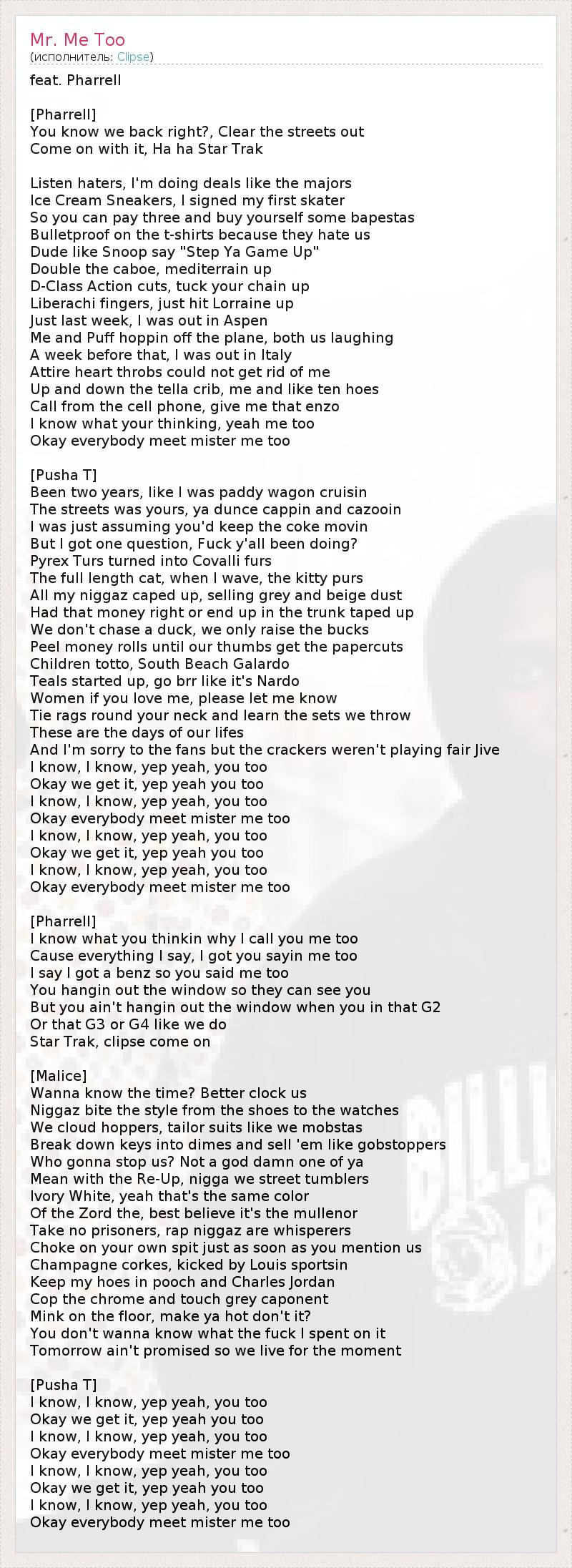 Это интересно:Clipse – выходцы из Бронкса. В их музыке нет ничего от Нью-Йорка и тем невероятнее звучит их происхождение. Братья Джин и Терренс Торнтоны (Malice и Pusha-T) перебрались в Вирджиния Бич, город на Атлантическом побережье, где взяли начало карьеры таких людей как Timbaland и The Neptunes.По словам Malice, сначала они собирались назваться Full Eclipse, "полное... продолжение