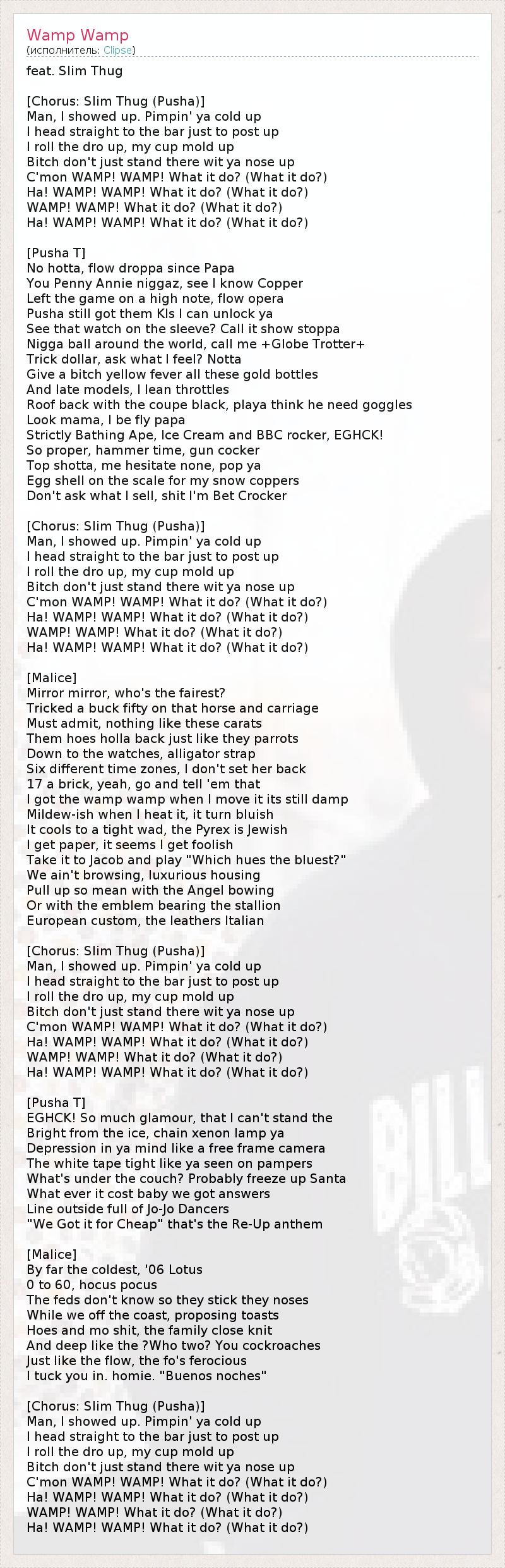 feat. Slim Thug [Chorus: Slim Thug (Pusha)] Man, I showed up. Pimpin' ya cold up I head straight to the bar just to post up I roll the dro up, my cup mold up Bitch don't just stand there wit ya nose up C'mon WAMP! WAMP! What it do? (What it do?) Ha! WAMP! WAMP! What it do? (What it do?) WAMP! WAMP! What it do? (What it do?) Ha! WAMP! WAMP! What it do? (What it do?) [Pusha T] No hotta, flow droppa since Papa You Penny Annie niggaz, see I know Copper Left the game on a high note, flow opera Pusha still got them KIs I can unlock ya See that watch on the sleeve? Call it show stoppa Nigga ball around the world, call me +Globe Trotter+ Trick dollar, ask what I feel? Notta Give a bitch yellow fever all these gold bottles And late models, I lean throttles Roof back with the coupe black, playa think he need goggles Look mama, I be fly papa Strictly Bathing Ape, Ice Cream and BBC rocker, EGHCK! So proper, hammer time, gun cocker Top shotta, me hesitate none, pop ya Egg shell on the scale for my snow coppers Don't ask what I sell, shit I'm Bet Crocker [Chorus: Slim Thug (Pusha)] Man, I showed up. Pimpin' ya cold up I head straight to the bar just to post up I roll the dro up, my cup mold up Bitch don't just stand there wit ya nose up C'mon WAMP! WAMP! What it do? (What it do?) Ha! WAMP! WAMP! What it do? (What it do?) WAMP! WAMP! What it do? (What it do?) Ha! WAMP! WAMP! What it do? (What it do?) [Malice] Mirror mirror, who's the fairest? Tricked a buck fifty on that horse and carriage Must admit, nothing like these carats Them hoes holla back just like they parrots Down to the watches, alligator strap Six different time zones, I don't set her back 17 a brick, yeah, go and tell 'em that I got the wamp wamp when I move it its still damp Mildew-ish when I heat it, it turn bluish It cools to a tight wad, the Pyrex is Jewish I get paper, it seems I get foolish Take it to Jacob and play "Which hues the bluest?" We ain't browsing, luxurious housing Pull up so mean with the Angel bowing Or with the emblem bearing the stallion European custom, the leathers Italian [Chorus: Slim Thug (Pusha)] Man, I showed up. Pimpin' ya cold up I head straight to the bar just to post up I roll the dro up, my cup mold up Bitch don't just stand there wit ya nose up C'mon WAMP! WAMP! What it do? (What it do?) Ha! WAMP! WAMP! What it do? (What it do?) WAMP! WAMP! What it do? (What it do?) Ha! WAMP! WAMP! What it do? (What it do?) [Pusha T] EGHCK! So much glamour, that I can't stand the Bright from the ice, chain xenon lamp ya Depression in ya mind like a free frame camera The white tape tight like ya seen on pampers What's under the couch? Probably freeze up Santa What ever it cost baby we got answers Line outside full of Jo-Jo Dancers "We Got it for Cheap" that's the Re-Up anthem [Malice] By far the coldest, '06 Lotus 0 to 60, hocus pocus The feds don't know so they stick they noses While we off the coast, proposing toasts Hoes and mo shit, the family close knit And deep like the ?Who two? You cockroaches Just like the flow, the fo's ferocious I tuck you in. homie. "Buenos noches" [Chorus: Slim Thug (Pusha)] Man, I showed up. Pimpin' ya cold up I head straight to the bar just to post up I roll the dro up, my cup mold up Bitch don't just stand there wit ya nose up C'mon WAMP! WAMP! What it do? (What it do?) Ha! WAMP! WAMP! What it do? (What it do?) WAMP! WAMP! What it do? (What it do?) Ha! WAMP! WAMP! What it do? (What it do?)