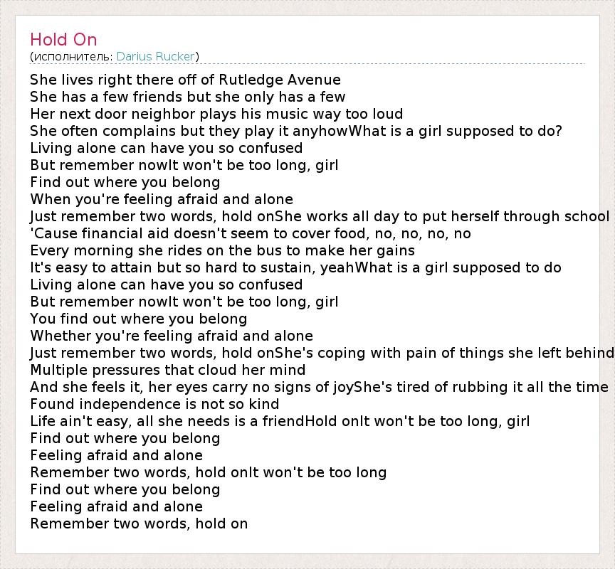 She lives right there off of Rutledge Avenue She has a few friends but she only has a few Her next door neighbor plays his music way too loud She often complains but they play it anyhowWhat is a girl supposed to do? Living alone can have you so confused But remember nowIt won't be too long, girl Find out where you belong When you're feeling afraid and alone Just remember two words, hold onShe works all day to put herself through school 'Cause financial aid doesn't seem to cover food, no, no, no, no Every morning she rides on the bus to make her gains It's easy to attain but so hard to sustain, yeahWhat is a girl supposed to do Living alone can have you so confused But remember nowIt won't be too long, girl You find out where you belong Whether you're feeling afraid and alone Just remember two words, hold onShe's coping with pain of things she left behind Multiple pressures that cloud her mind And she feels it, her eyes carry no signs of joyShe's tired of rubbing it all the time Found independence is not so kind Life ain't easy, all she needs is a friendHold onIt won't be too long, girl Find out where you belong Feeling afraid and alone Remember two words, hold onIt won't be too long Find out where you belong Feeling afraid and alone Remember two words, hold on