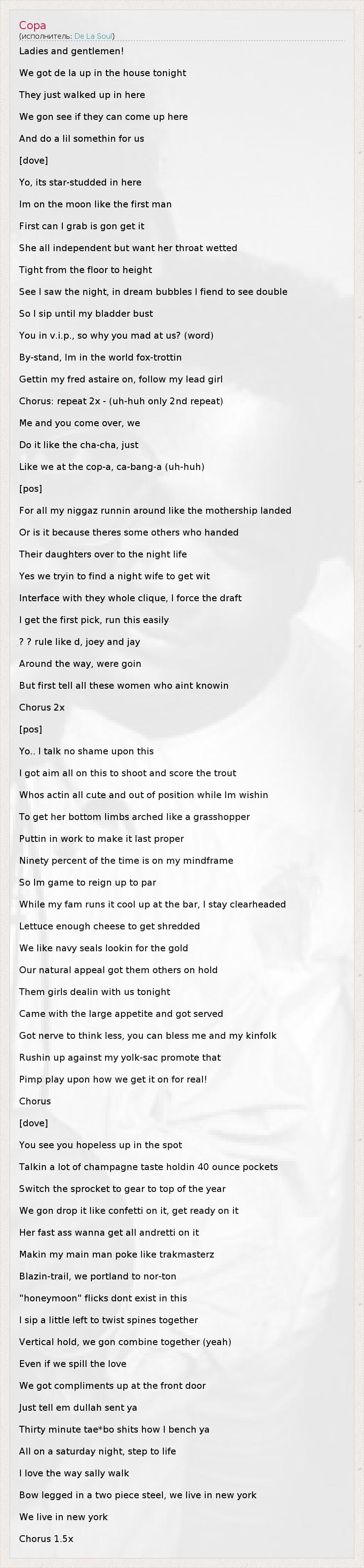 Это интересно:Благодаря участию в восхитительном сингле "Feel Good Inc" английского мультяшного ансамбля Gorillaz, американские хип-хоперы De La Soul снова в центре внимания. И даже те, кто ничего о них не слышал, набирают это название в поисковиках. А те, кто преклоняется перед этими людьми со времен их альбома "3 Feet High And Rising", удовлетворенно покачивают головами – ветераны получили второй... продолжение