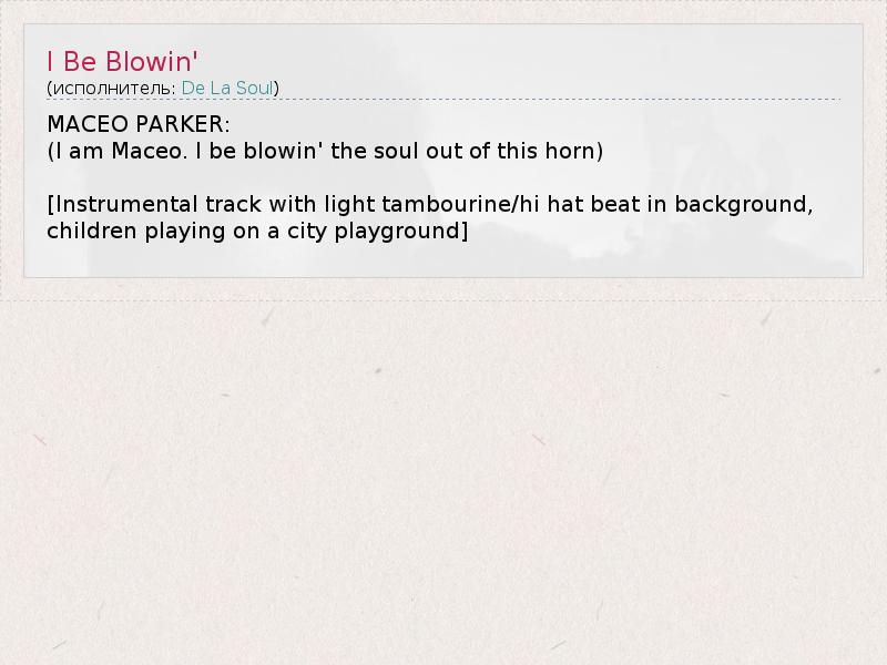 MACEO PARKER: (I am Maceo. I be blowin' the soul out of this horn) [Instrumental track with light tambourine/hi hat beat in background, children playing on a city playground]