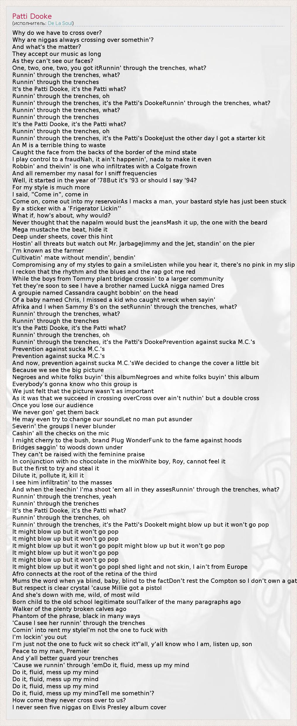 Runnin' through the trenches, it's the Patti's DookePrevention against sucka M.C.'s