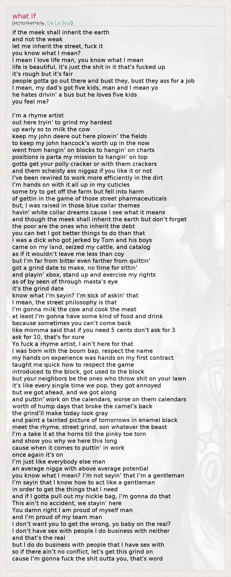 if the meek shall inherit the earth and not the weak let me inherit the street, fuck it you know what I mean? I mean I love life man, you know what I mean life is beautiful, it's just the shit in it that's fucked up it's rough but it's fair people gotta go out there and bust they, bust they ass for a job I mean, my dad's got five kids, man and I mean yo he hates drivin' a bus but he loves five kids you feel me? I'm a rhyme artist out here tryin' to grind my hardest up early so to milk the cow keep my john deere out here plowin' the fields to keep my john hancock's worth up in the now went from hangin' on blocks to hangin' on charts positions is parta my mission to hangin' on top gotta get your polly cracker or with them crackers and them scheisty ass niggaz if you like it or not I've been rewired to work more efficiently in the dirt I'm hands on with it all up in my cuticles some try to get off the farm but fell into harm of gettin in the game of those street pharmaceuticals but, I was raised in those blue collar themes havin' white collar dreams cause I see what it means and though the meek shall inherit the earth but don't forget the poor are the ones who inherit the debt you can bet I got better things to do than that I was a dick who got jerked by Tom and his boys came on my land, seized my cattle, and catalog as if it wouldn't leave me less than coy but I'm far from bitter even farther from quittin' got a grind date to make, no time for sittin' and playin' xbox, stand up and exercise my rights as of by seen of through masta's eye it's the grind date know what I'm sayin? I'm sick of askin' that I mean, the street philosophy is that I'm gonna milk the cow and cook the meat at least I'm gonna have some kind of food and drink because sometimes you can't come back like momma said that if you need 5 cents don't ask for 3 ask for 10, that's for sure Yo fuck a rhyme artist, I ain't here for that I was born with the boom bap, respect the name my hands on experience was hands on my first contract taught me quick how to respect the game introduced to the block, got used to the block but your neighbors be the ones who throw shit on your lawn it's like every single time we pop, they got annoyed but we got ahead, and we got along and puttin' work on the calendars, worse on them calendars worth of hump days that broke the camel's back the grind'll make today look gray and paint a tainted picture of tomorrows in enamel black meet the rhyme, street grind, son whatever the beast I'm a take it at the horns till the pinky toe torn and show you why we here this long cause when it comes to puttin' in work once again it's on I'm just like everybody else man an average nigga with above average potential you know what I mean? I'm not sayin' that I'm a gentleman I'm sayin that I know how to act like a gentleman in order to get the things that I need and if I gotta pull out my nickle bag, I'm gonna do that This ain't no accident, we stayin' here You damn right I am proud of myself man and I'm proud of my team man I don't want you to get the wrong, yo baby on the real? I don't have sex with people I do business with neither and that's the real but I do do business with people that I have sex with so if there ain't no conflict, let's get this grind on cause I'm gonna fuck the shit outta you, that's word
