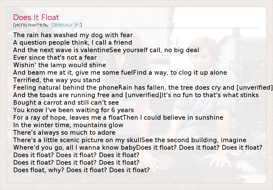 The rain has washed my dog with fear A question people think, I call a friend And the next wave is valentineSee yourself call, no big deal Ever since that's not a fear Wishin' the lamp would shine And beam me at it, give me some fuelFind a way, to clog it up alone Terrified, the way you stand Feeling natural behind the phoneRain has fallen, the tree does cry and [unverified] And the toads are running free and [unverified]It's no fun to that's what stinks Bought a carrot and still can't see You know I've been waiting for 6 years For a ray of hope, leaves me a floatThen I could believe in sunshine In the winter time, mountains glow There's always so much to adore There's a little scenic picture on my skullSee the second building, imagine Where'd you go, all I wanna know babyDoes it float? Does it float? Does it float? Does it float? Does it float? Does it float? Does it float? Does it float? Does it float? Does float, why? Does it float? Does it float?