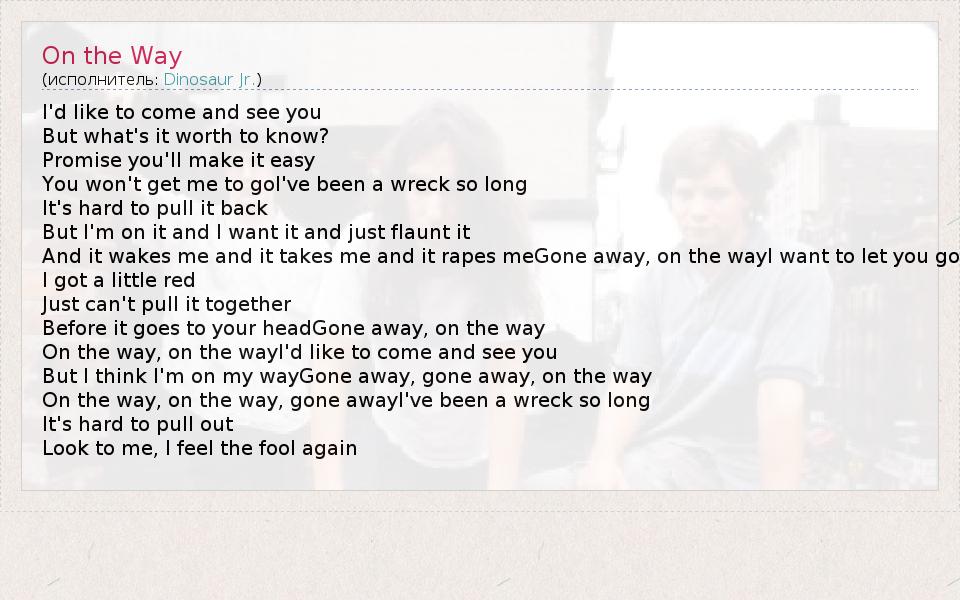 I'd like to come and see you But what's it worth to know? Promise you'll make it easy You won't get me to goI've been a wreck so long It's hard to pull it back But I'm on it and I want it and just flaunt it And it wakes me and it takes me and it rapes meGone away, on the wayI want to let you go I got a little red Just can't pull it together Before it goes to your headGone away, on the way On the way, on the wayI'd like to come and see you But I think I'm on my wayGone away, gone away, on the way On the way, on the way, gone awayI've been a wreck so long It's hard to pull out Look to me, I feel the fool again