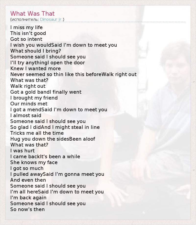 I miss my life This isn't good Got so intent I wish you wouldSaid I'm down to meet you What should I bring? Someone said I should see you I'll try anythingI open the door Knew I wanted more Never seemed so thin like this beforeWalk right out What was that? Walk right out Got a gold bandI finally went I brought my friend Our minds met I got a mendSaid I'm down to meet you I almost said Someone said I should see you So glad I didAnd I might steal in line Tricks me all the time Hug you down the sidesBeen aloof What was that? I was hurt I came backIt's been a while She knows my face I got so much I pulled awaySaid I'm gonna meet you And even then Someone said I should see you I'm all hereSaid I'm down to meet you I'm back again Someone said I should see you So now's then