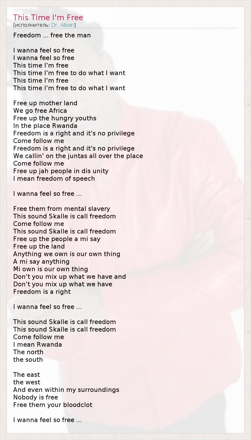 Freedom ... free the man I wanna feel so free I wanna feel so free This time I'm free This time I'm free to do what I want This time I'm free This time I'm free to do what I want Free up mother land We go free Africa Free up the hungry youths In the place Rwanda Freedom is a right and it's no privilege Come follow me Freedom is a right and it's no privilege We callin' on the juntas all over the place Come follow me Free up jah people in dis unity I mean freedom of speech I wanna feel so free ... Free them from mental slavery This sound Skalle is call freedom Come follow me This sound Skalle is call freedom Free up the people a mi say Free up the land Anything we own is our own thing A mi say anything Mi own is our own thing Don't you mix up what we have and Don't you mix up what we have Freedom is a right I wanna feel so free ... This sound Skalle is call freedom This sound Skalle is call freedom Come follow me I mean Rwanda The north the south The east the west And even within my surroundings Nobody is free Free them your bloodclot I wanna feel so free ...