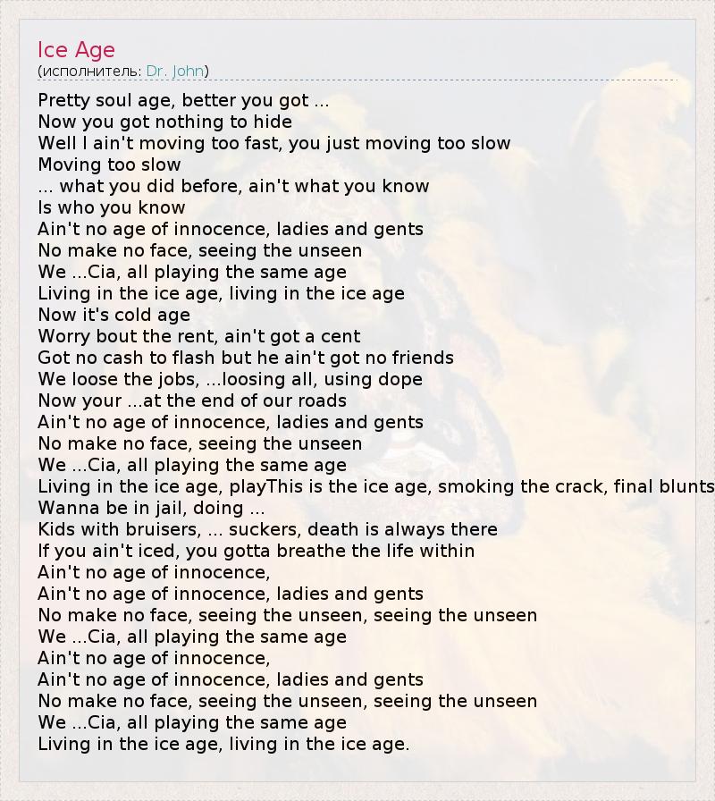 Pretty soul age, better you got ... Now you got nothing to hide Well I ain't moving too fast, you just moving too slow Moving too slow ... what you did before, ain't what you know Is who you know Ain't no age of innocence, ladies and gents No make no face, seeing the unseen We ...Cia, all playing the same age Living in the ice age, living in the ice age Now it's cold age Worry bout the rent, ain't got a cent Got no cash to flash but he ain't got no friends We loose the jobs, ...loosing all, using dope Now your ...at the end of our roads Ain't no age of innocence, ladies and gents No make no face, seeing the unseen We ...Cia, all playing the same age Living in the ice age, playThis is the ice age, smoking the crack, final blunts Wanna be in jail, doing ... Kids with bruisers, ... suckers, death is always there If you ain't iced, you gotta breathe the life within Ain't no age of innocence, Ain't no age of innocence, ladies and gents No make no face, seeing the unseen, seeing the unseen We ...Cia, all playing the same age Ain't no age of innocence, Ain't no age of innocence, ladies and gents No make no face, seeing the unseen, seeing the unseen We ...Cia, all playing the same age Living in the ice age, living in the ice age.