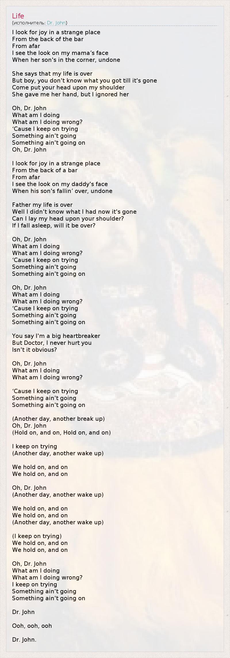I look for joy in a strange place From the back of the bar From afar I see the look on my mama’s face When her son's in the corner, undone She says that my life is over But boy, you don't know what you got till it's gone Come put your head upon my shoulder She gave me her hand, but I ignored her Oh, Dr. John What am I doing What am I doing wrong? ‘Cause I keep on trying Something ain't going Something ain't going on Oh, Dr. John I look for joy in a strange place From the back of a bar From afar I see the look on my daddy's face When his son's fallin’ over, undone Father my life is over Well I didn't know what I had now it's gone Can I lay my head upon your shoulder? If I fall asleep, will it be over? Oh, Dr. John What am I doing What am I doing wrong? ‘Cause I keep on trying Something ain't going Something ain't going on Oh, Dr. John What am I doing What am I doing wrong? ‘Cause I keep on trying Something ain't going Something ain't going on You say I'm a big heartbreaker But Doctor, I never hurt you Isn't it obvious? Oh, Dr. John What am I doing What am I doing wrong? ‘Cause I keep on trying Something ain't going Something ain't going on (Another day, another break up) Oh, Dr. John (Hold on, and on, Hold on, and on) I keep on trying (Another day, another wake up) We hold on, and on We hold on, and on Oh, Dr. John (Another day, another wake up) We hold on, and on We hold on, and on (Another day, another wake up) (I keep on trying) We hold on, and on We hold on, and on Oh, Dr. John What am I doing What am I doing wrong? I keep on trying Something ain't going Something ain't going on Dr. John Ooh, ooh, ooh Dr. John.