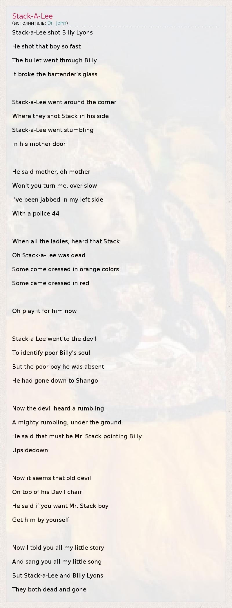 Stack-a-Lee shot Billy Lyons He shot that boy so fast The bullet went through Billy it broke the bartender's glass Stack-a-Lee went around the corner Where they shot Stack in his side Stack-a-Lee went stumbling In his mother door He said mother, oh mother Won't you turn me, over slow I've been jabbed in my left side With a police 44 When all the ladies, heard that Stack Oh Stack-a-Lee was dead Some come dressed in orange colors Some came dressed in red Oh play it for him now Stack-a Lee went to the devil To identify poor Billy's soul But the poor boy he was absent He had gone down to Shango Now the devil heard a rumbling A mighty rumbling, under the ground He said that must be Mr. Stack pointing Billy Upsidedown Now it seems that old devil On top of his Devil chair He said if you want Mr. Stack boy Get him by yourself Now I told you all my little story And sang you all my little song But Stack-a-Lee and Billy Lyons They both dead and gone