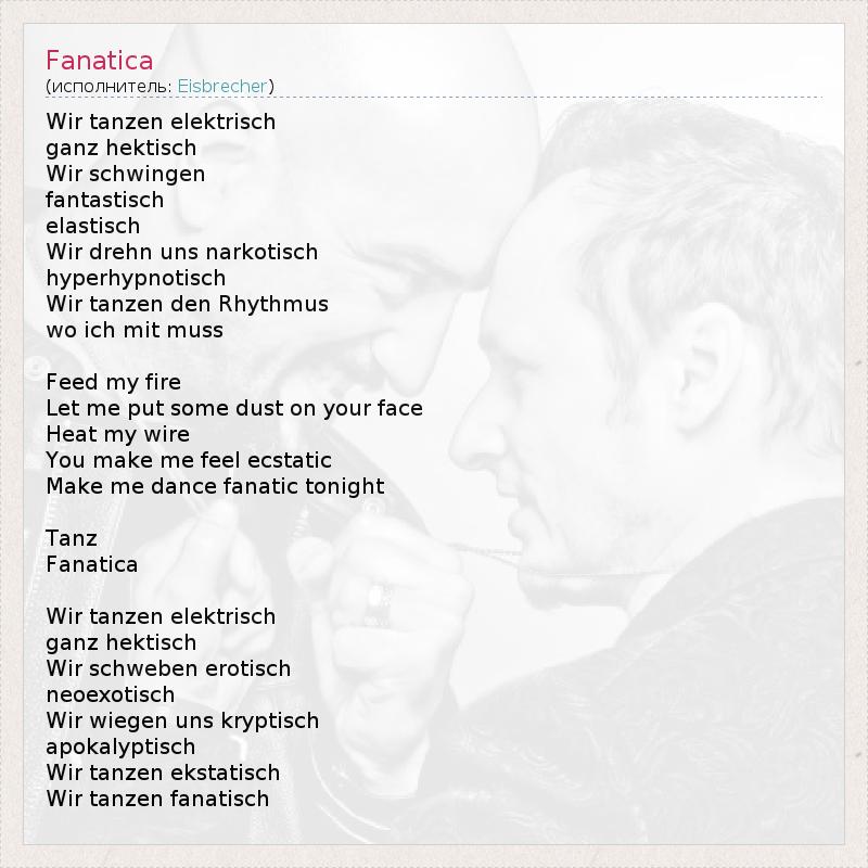 Мы танцуем электрически, Довольно лихорадочно. Мы раскачиваемся Фантастично, Эластично. Мы кружимся наркотически, Гипергипнотично. Мы танцуем под ритм, И я тоже должен. Питай мой огонь. Дай я посыплю пылью твое лицо. Накали мои провода. Ты вводишь меня в транс. Заставь меня танцевать фанатично сегодня ночью. Танцуй, Фанатка. Мы танцуем электрически, Довольно лихорадочно. Мы парим эротично, Неоэкзотично. Мы раскачиваемся криптично, Апокалипсически. Мы танцуем экстатично. Мы танцуем фанатично.