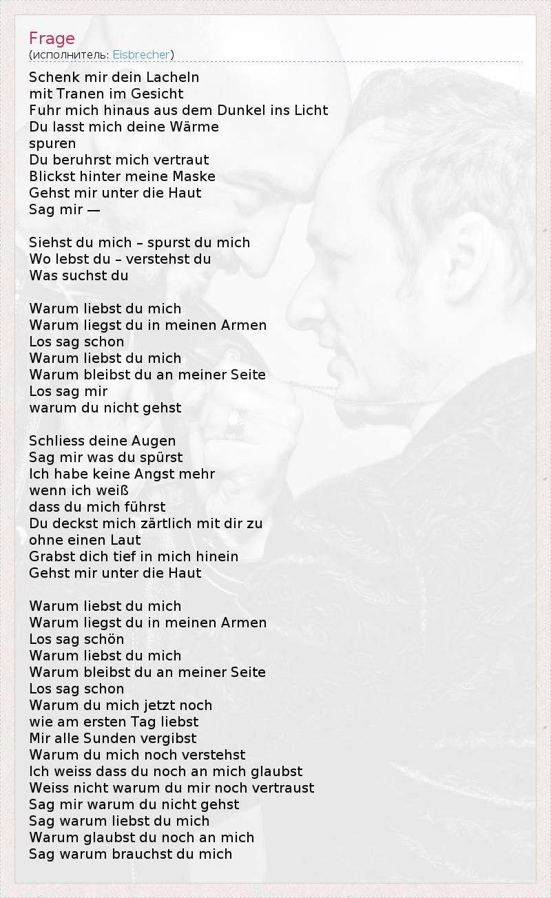 Schenk mir dein Lacheln mit Tranen im Gesicht Fuhr mich hinaus aus dem Dunkel ins Licht Du lasst mich deine Wärme spuren Du beruhrst mich vertraut Blickst hinter meine Maske Gehst mir unter die Haut Sag mir — Siehst du mich – spurst du mich Wo lebst du – verstehst du Was suchst du Warum liebst du mich Warum liegst du in meinen Armen Los sag schon Warum liebst du mich Warum bleibst du an meiner Seite Los sag mir warum du nicht gehst Schliess deine Augen Sag mir was du spürst Ich habe keine Angst mehr wenn ich weiß dass du mich führst Du deckst mich zärtlich mit dir zu ohne einen Laut Grabst dich tief in mich hinein Gehst mir unter die Haut Warum liebst du mich Warum liegst du in meinen Armen Los sag schön Warum liebst du mich Warum bleibst du an meiner Seite Los sag schon Warum du mich jetzt noch wie am ersten Tag liebst Mir alle Sunden vergibst Warum du mich noch verstehst Ich weiss dass du noch an mich glaubst Weiss nicht warum du mir noch vertraust Sag mir warum du nicht gehst Sag warum liebst du mich Warum glaubst du noch an mich Sag warum brauchst du mich