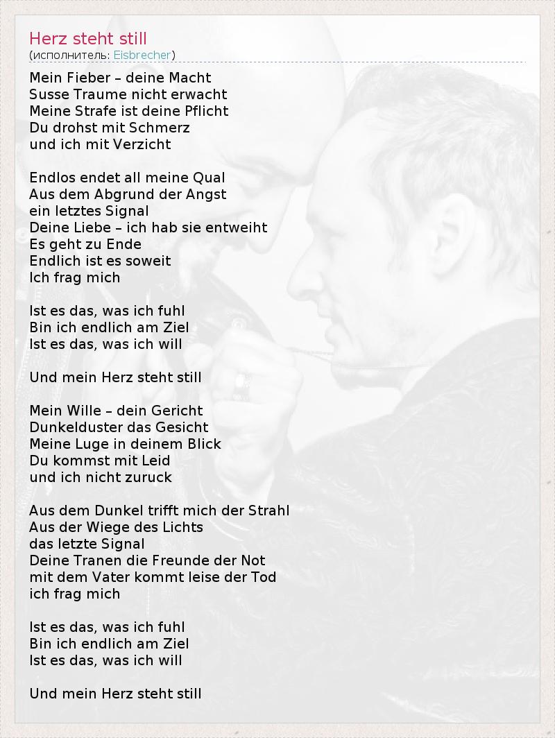 Mein Fieber – deine Macht Susse Traume nicht erwacht Meine Strafe ist deine Pflicht Du drohst mit Schmerz und ich mit Verzicht Endlos endet all meine Qual Aus dem Abgrund der Angst ein letztes Signal Deine Liebe – ich hab sie entweiht Es geht zu Ende Endlich ist es soweit Ich frag mich Ist es das, was ich fuhl Bin ich endlich am Ziel Ist es das, was ich will Und mein Herz steht still Mein Wille – dein Gericht Dunkelduster das Gesicht Meine Luge in deinem Blick Du kommst mit Leid und ich nicht zuruck Aus dem Dunkel trifft mich der Strahl Aus der Wiege des Lichts das letzte Signal Deine Tranen die Freunde der Not mit dem Vater kommt leise der Tod ich frag mich Ist es das, was ich fuhl Bin ich endlich am Ziel Ist es das, was ich will Und mein Herz steht still
