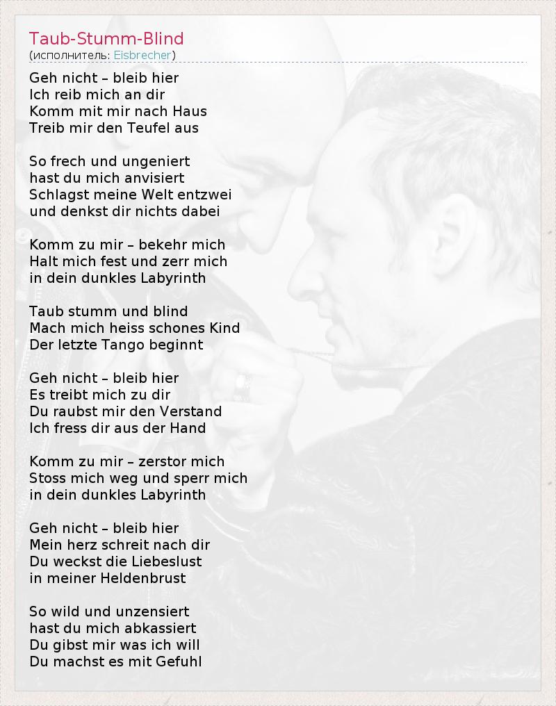 Geh nicht – bleib hier Ich reib mich an dir Komm mit mir nach Haus Treib mir den Teufel aus So frech und ungeniert hast du mich anvisiert Schlagst meine Welt entzwei und denkst dir nichts dabei Komm zu mir – bekehr mich Halt mich fest und zerr mich in dein dunkles Labyrinth Taub stumm und blind Mach mich heiss schones Kind Der letzte Tango beginnt Geh nicht – bleib hier Es treibt mich zu dir Du raubst mir den Verstand Ich fress dir aus der Hand Komm zu mir – zerstor mich Stoss mich weg und sperr mich in dein dunkles Labyrinth Geh nicht – bleib hier Mein herz schreit nach dir Du weckst die Liebeslust in meiner Heldenbrust So wild und unzensiert hast du mich abkassiert Du gibst mir was ich will Du machst es mit Gefuhl