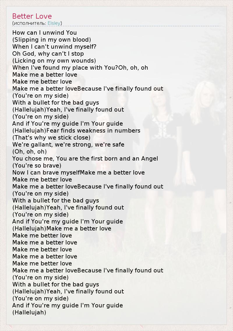 Это интересно:Eisley (Айсли) – инди-поп-рок-группа из города Тайлер, штат ТехасГруппа состоит из 5-ти участников:Шерри ДюПре - гитара, вокал; Стэйси ДюПре - клавишные, вокал; Уэстон ДюПре – ударные; Шантель ДюПре – гитара; Гэррон ДюПре – бас.Вначале, группа называлась Mos Eisley (как в Звёздных войнах), но потом, название сократили до Eisley, перед туром с Coldplay.Eisley выступали с такими группами, как Taking Back... продолжение