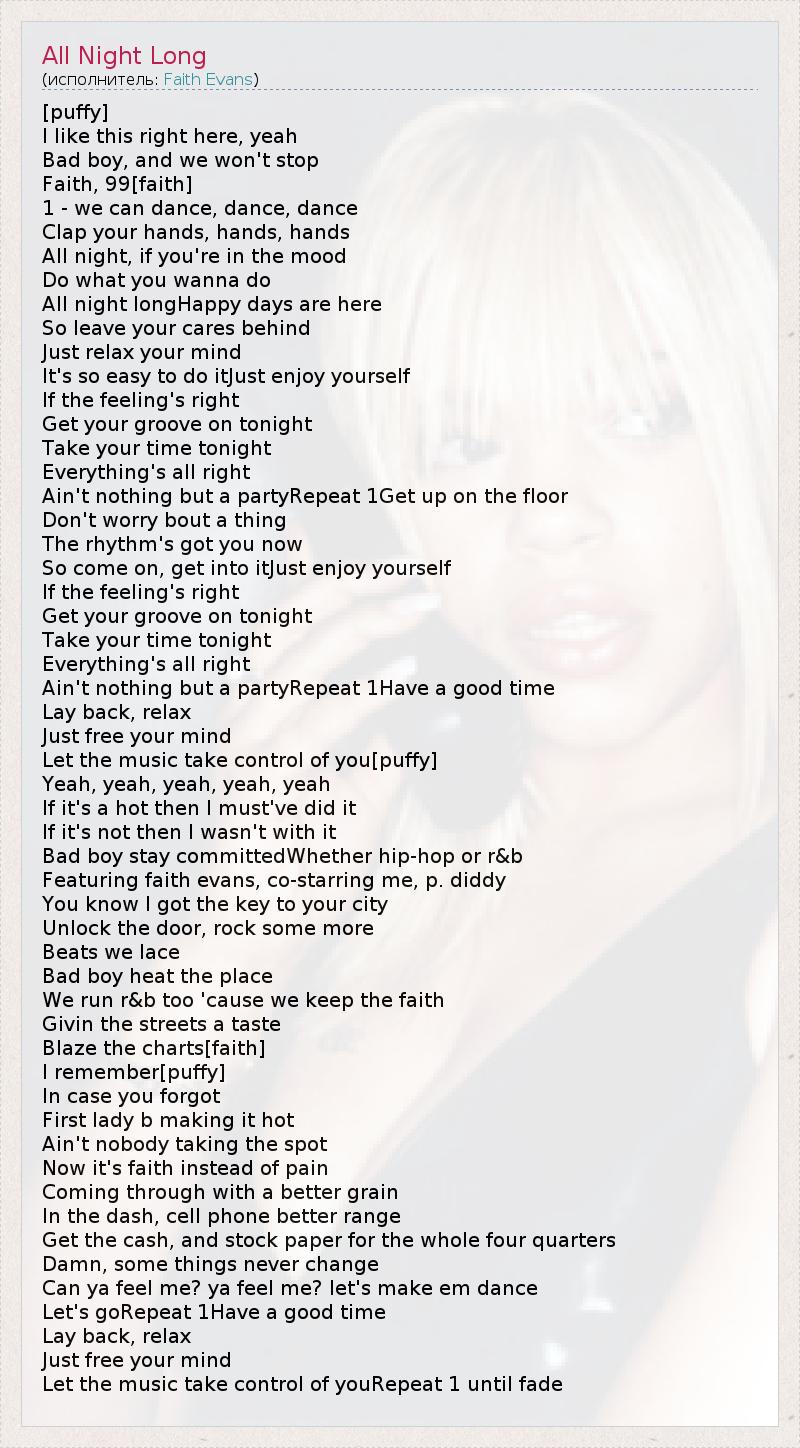 Это интересно:Faith Evans родилась в 1973 году во Флориде, но переехала в Newark (New Jersey) где и росла, живя вместе с матерью, бабушкой и дедушкой. По легенде, она уже в два года пела в церкви. Затем она пела в школе, пока училась, а в последствии даже выиграла по конкурсу обучение в Fordham University с оплачиваемой стипендией.Отучившись год, Faith Evans бросила колледж чтобы проверить, можно ли зарабатывать с помощью собственного... продолжение