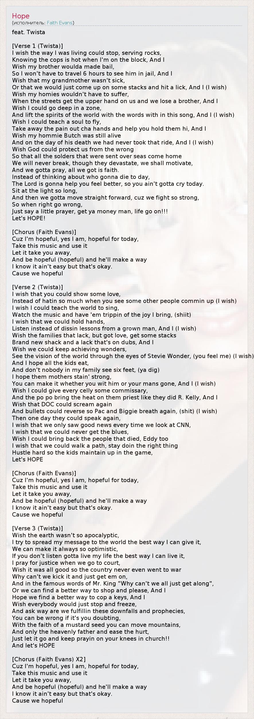 Это интересно:Faith Evans родилась в 1973 году во Флориде, но переехала в Newark (New Jersey) где и росла, живя вместе с матерью, бабушкой и дедушкой. По легенде, она уже в два года пела в церкви. Затем она пела в школе, пока училась, а в последствии даже выиграла по конкурсу обучение в Fordham University с оплачиваемой стипендией.Отучившись год, Faith Evans бросила колледж чтобы проверить, можно ли зарабатывать с помощью собственного... продолжение