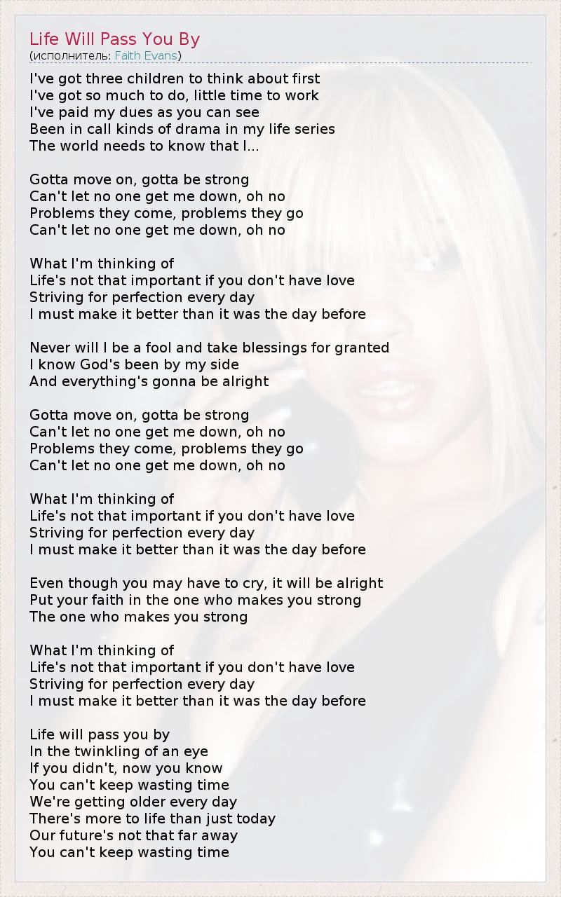 I've got three children to think about first I've got so much to do, little time to work I've paid my dues as you can see Been in call kinds of drama in my life series The world needs to know that I... Gotta move on, gotta be strong Can't let no one get me down, oh no Problems they come, problems they go Can't let no one get me down, oh no What I'm thinking of Life's not that important if you don't have love Striving for perfection every day I must make it better than it was the day before Never will I be a fool and take blessings for granted I know God's been by my side And everything's gonna be alright Gotta move on, gotta be strong Can't let no one get me down, oh no Problems they come, problems they go Can't let no one get me down, oh no What I'm thinking of Life's not that important if you don't have love Striving for perfection every day I must make it better than it was the day before Even though you may have to cry, it will be alright Put your faith in the one who makes you strong The one who makes you strong What I'm thinking of Life's not that important if you don't have love Striving for perfection every day I must make it better than it was the day before Life will pass you by In the twinkling of an eye If you didn't, now you know You can't keep wasting time We're getting older every day There's more to life than just today Our future's not that far away You can't keep wasting time
