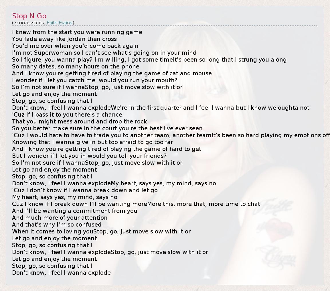I knew from the start you were running game You fade away like Jordan then cross You'd me over when you'd come back again I'm not Superwoman so I can't see what's going on in your mind So I figure, you wanna play? I'm willing, I got some timeIt's been so long that I strung you along So many dates, so many hours on the phone And I know you're getting tired of playing the game of cat and mouse I wonder if I let you catch me, would you run your mouth? So I'm not sure if I wannaStop, go, just move slow with it or Let go and enjoy the moment Stop, go, so confusing that I Don't know, I feel I wanna explodeWe're in the first quarter and I feel I wanna but I know we oughta not 'Cuz if I pass it to you there's a chance That you might mess around and drop the rock So you better make sure in the court you're the best I've ever seen 'Cuz I would hate to have to trade you to another team, another teamIt's been so hard playing my emotions off Knowing that I wanna give in but too afraid to go too far And I know you're getting tired of playing the game of hard to get But I wonder if I let you in would you tell your friends? So I'm not sure if I wannaStop, go, just move slow with it or Let go and enjoy the moment Stop, go, so confusing that I Don't know, I feel I wanna explodeMy heart, says yes, my mind, says no 'Cuz I don't know if I wanna break down and let go My heart, says yes, my mind, says no Cuz I know if I break down I'll be wanting moreMore this, more that, more time to chat And I'll be wanting a commitment from you And much more of your attention And that's why I'm so confused When it comes to loving youStop, go, just move slow with it or Let go and enjoy the moment Stop, go, so confusing that I Don't know, I feel I wanna explodeStop, go, just move slow with it or Let go and enjoy the moment Stop, go, so confusing that I Don't know, I feel I wanna explode
