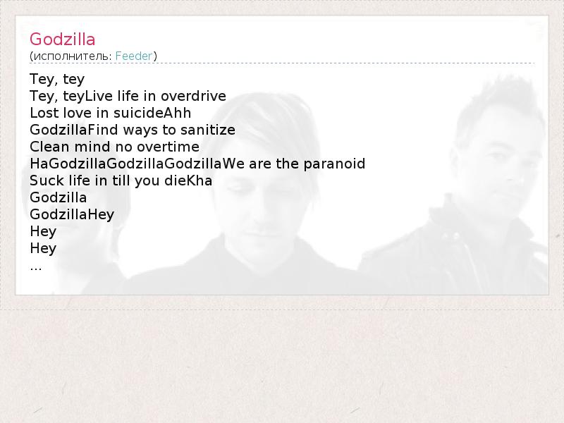 Tey, tey Tey, teyLive life in overdrive Lost love in suicideAhh GodzillaFind ways to sanitize Clean mind no overtime HaGodzillaGodzillaGodzillaWe are the paranoid Suck life in till you dieKha Godzilla GodzillaHey Hey Hey ...