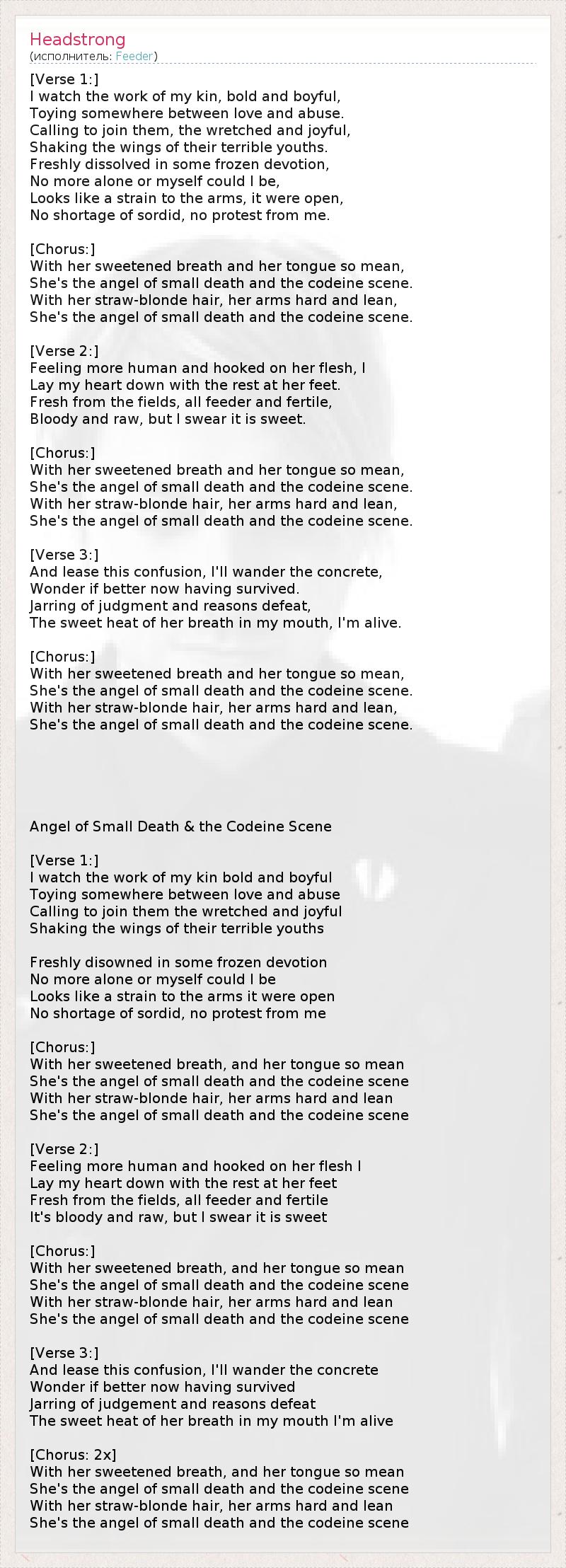 * — Small death — калька с французской идиомы "la petite mort", являющейся эвфемизмом для описания ощущений после оргазма у женщин. Кодеин (3-метилморфин) — алкалоид опиума, используется как противокашлевое лекарственное средство центрального действия, обычно в сочетании с другими веществами, например, с терпингидратом, обладает слабым наркотическим (опиатным) и болеутоляющим эффектом, в связи с чем, используется также как компонент болеутоляющих лекарств.