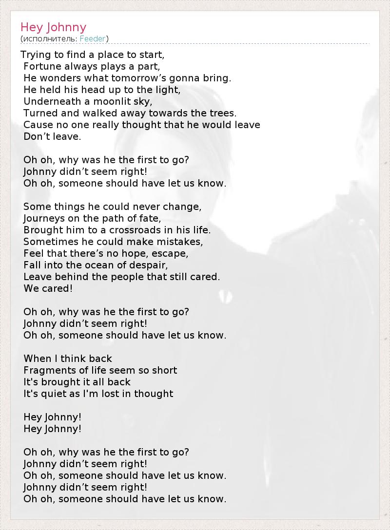Пытаясь найти место , чтобы начать, Фортуна всегда играет свою роль, Он задается вопросом, что принесет завтрашний собираюсь . Он держал его голову к свету, Под лунную небо, Повернулся и пошел прочь в сторону деревьев. Причина никто не думал, что он хотел бы оставить Не оставляйте . О о, почему он былпервым, чтобы пойти ? Джонни не кажется правильным ! О о, кто-то должен был позволить нам знать. Некоторые вещи, которые он никогда не мог изменить , Путешествия на пути судьбы, Привел его к перекрестке в его жизни. Иногда он может ошибаться, Почувствуйте, что нет никакой надежды , побег, Падение в океан отчаяния , Оставьте позади людей , которые все еще заботятся . Мы заботились ! О о, почему он былпервым, чтобы пойти ? Джонни не кажется правильным ! О о, кто-то должен был позволить нам знать. Когда я вспоминаю Фрагменты жизни , кажется таким коротким Это принес все это обратно Это тихое , как я в задумчивости Эй Джонни ! Эй Джонни ! О о, почему он былпервым, чтобы пойти ? Джонни не кажется правильным ! О о, кто-то должен был позволить нам знать. Джонни не кажется правильным ! О о, кто-то должен был позволить нам знать.
