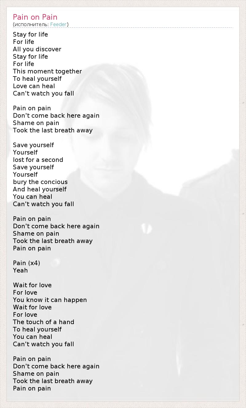 Stay for life For life All you discover Stay for life For life This moment together To heal yourself Love can heal Can't watch you fall Pain on pain Don't come back here again Shame on pain Took the last breath away Save yourself Yourself lost for a second Save yourself Yourself bury the concious And heal yourself You can heal Can't watch you fall Pain on pain Don't come back here again Shame on pain Took the last breath away Pain on pain Pain (x4) Yeah Wait for love For love You know it can happen Wait for love For love The touch of a hand To heal yourself You can heal Can't watch you fall Pain on pain Don't come back here again Shame on pain Took the last breath away Pain on pain