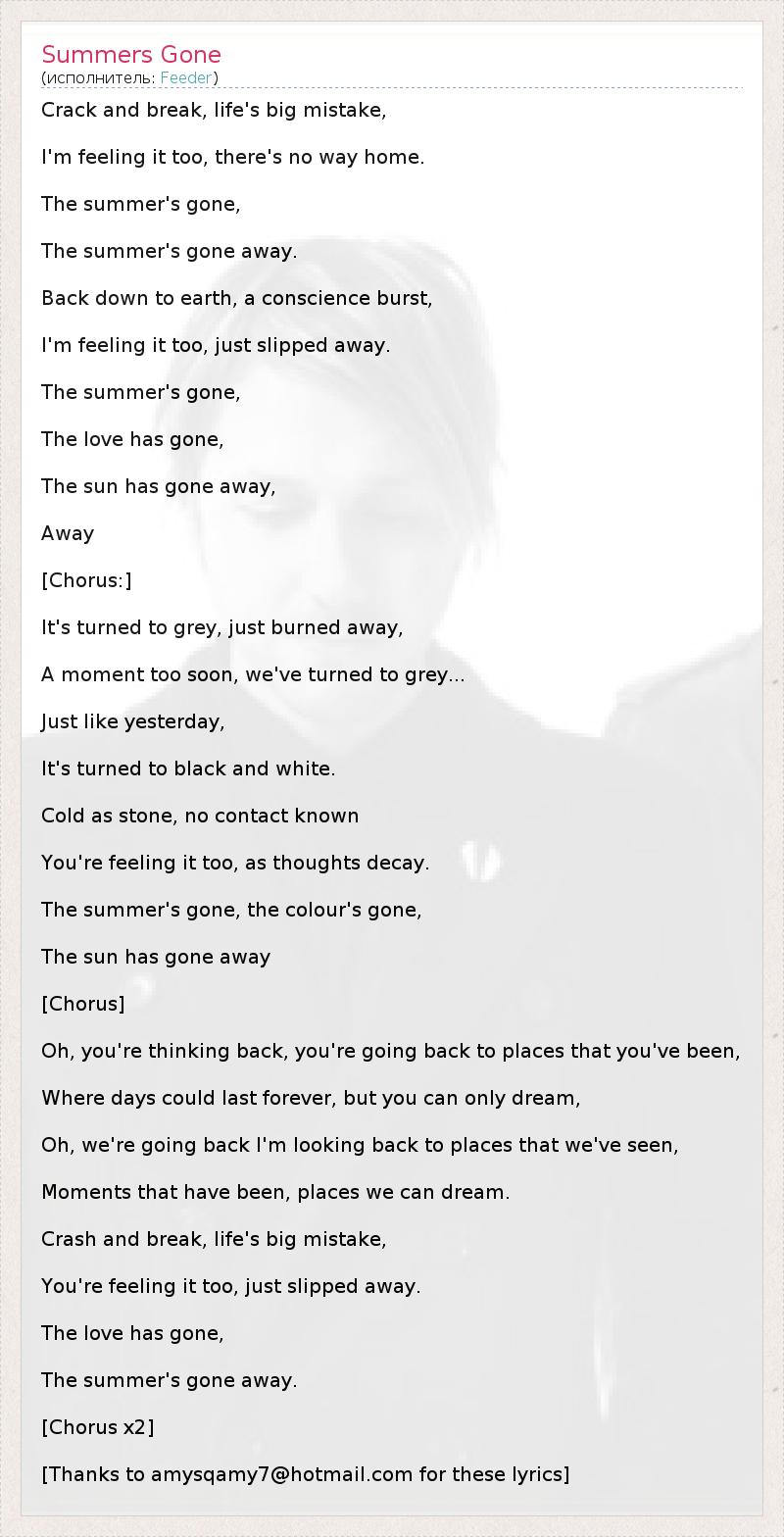 Crack and break, life's big mistake, I'm feeling it too, there's no way home. The summer's gone, The summer's gone away. Back down to earth, a conscience burst, I'm feeling it too, just slipped away. The summer's gone, The love has gone, The sun has gone away, Away [Chorus:] It's turned to grey, just burned away, A moment too soon, we've turned to grey... Just like yesterday, It's turned to black and white. Cold as stone, no contact known You're feeling it too, as thoughts decay. The summer's gone, the colour's gone, The sun has gone away [Chorus] Oh, you're thinking back, you're going back to places that you've been, Where days could last forever, but you can only dream, Oh, we're going back I'm looking back to places that we've seen, Moments that have been, places we can dream. Crash and break, life's big mistake, You're feeling it too, just slipped away. The love has gone, The summer's gone away. [Chorus x2] [Thanks to amysqamy7@hotmail.com for these lyrics]