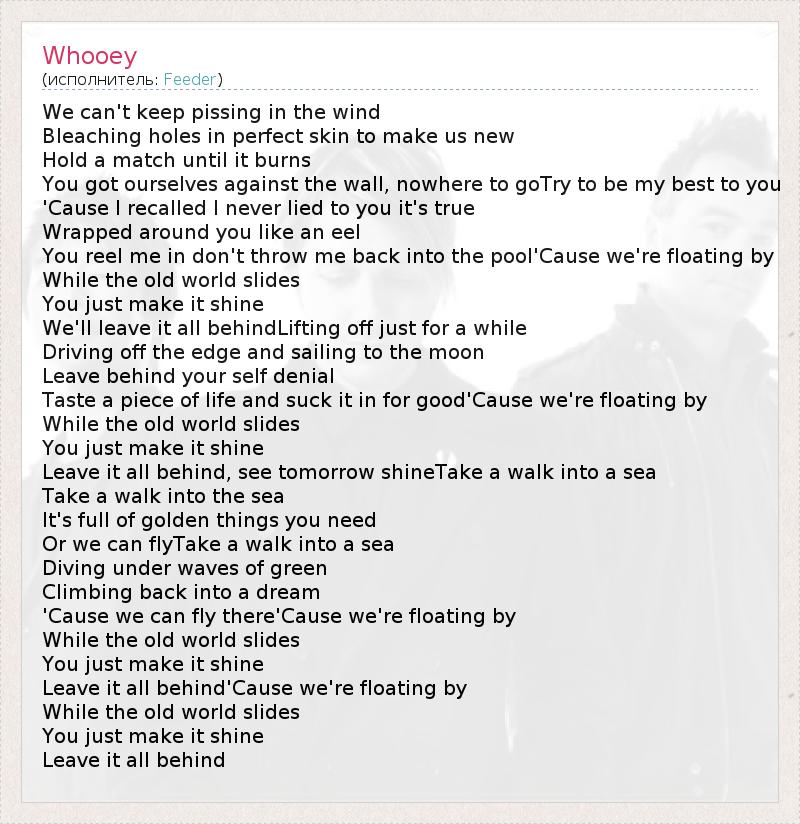 We can't keep pissing in the wind Bleaching holes in perfect skin to make us new Hold a match until it burns You got ourselves against the wall, nowhere to goTry to be my best to you 'Cause I recalled I never lied to you it's true Wrapped around you like an eel You reel me in don't throw me back into the pool'Cause we're floating by While the old world slides You just make it shine We'll leave it all behindLifting off just for a while Driving off the edge and sailing to the moon Leave behind your self denial Taste a piece of life and suck it in for good'Cause we're floating by While the old world slides You just make it shine Leave it all behind, see tomorrow shineTake a walk into a sea Take a walk into the sea It's full of golden things you need Or we can flyTake a walk into a sea Diving under waves of green Climbing back into a dream 'Cause we can fly there'Cause we're floating by While the old world slides You just make it shine Leave it all behind'Cause we're floating by While the old world slides You just make it shine Leave it all behind