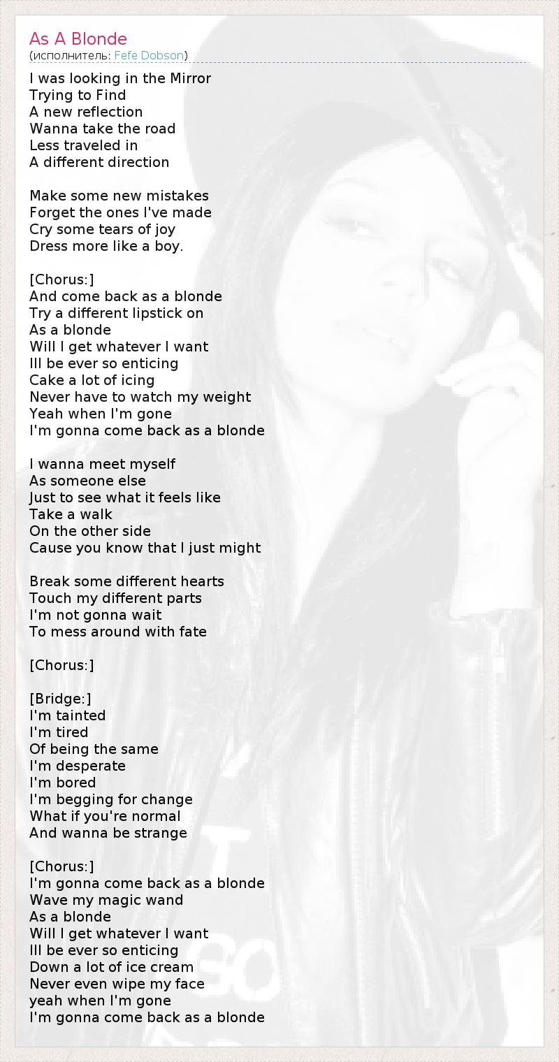 I was looking in the Mirror Trying to Find A new reflection Wanna take the road Less traveled in A different direction Make some new mistakes Forget the ones I've made Cry some tears of joy Dress more like a boy. [Chorus:] And come back as a blonde Try a different lipstick on As a blonde Will I get whatever I want Ill be ever so enticing Cake a lot of icing Never have to watch my weight Yeah when I'm gone I'm gonna come back as a blonde I wanna meet myself As someone else Just to see what it feels like Take a walk On the other side Cause you know that I just might Break some different hearts Touch my different parts I'm not gonna wait To mess around with fate [Chorus:] [Bridge:] I'm tainted I'm tired Of being the same I'm desperate I'm bored I'm begging for change What if you're normal And wanna be strange [Chorus:] I'm gonna come back as a blonde Wave my magic wand As a blonde Will I get whatever I want Ill be ever so enticing Down a lot of ice cream Never even wipe my face yeah when I'm gone I'm gonna come back as a blonde
