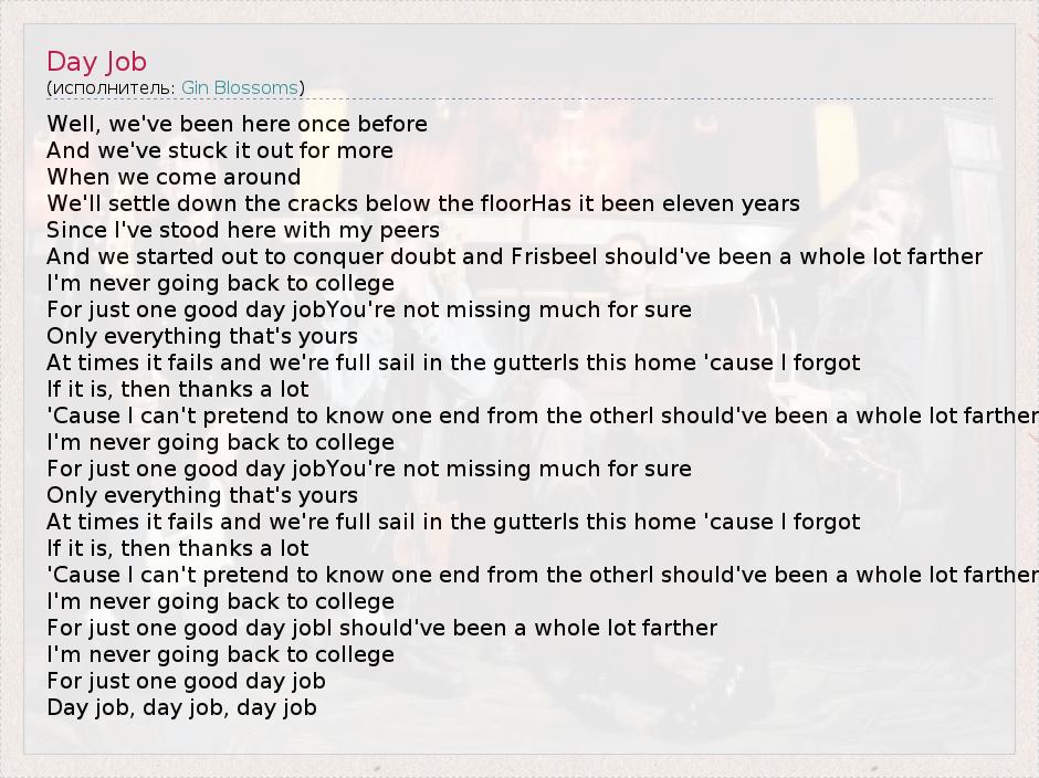 Well, we've been here once before And we've stuck it out for more When we come around We'll settle down the cracks below the floorHas it been eleven years Since I've stood here with my peers And we started out to conquer doubt and FrisbeeI should've been a whole lot farther I'm never going back to college For just one good day jobYou're not missing much for sure Only everything that's yours At times it fails and we're full sail in the gutterIs this home 'cause I forgot If it is, then thanks a lot 'Cause I can't pretend to know one end from the otherI should've been a whole lot farther I'm never going back to college For just one good day jobYou're not missing much for sure Only everything that's yours At times it fails and we're full sail in the gutterIs this home 'cause I forgot If it is, then thanks a lot 'Cause I can't pretend to know one end from the otherI should've been a whole lot farther I'm never going back to college For just one good day jobI should've been a whole lot farther I'm never going back to college For just one good day job Day job, day job, day job