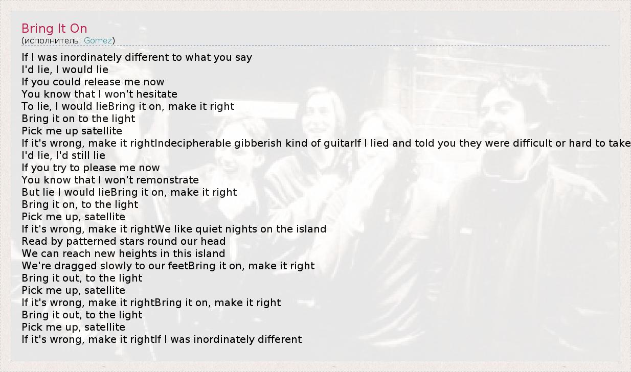 Это интересно:Группа образовалась в середине 1990-х через некоторое время после знакомства Иэна Бола (Ian Ball) и ударника Олли Пикока (Olly Peacock); вскоре к ребятам присоединились еще двое таких же музыкантов-любителей — гитарист и по совместительству клавишник Том Грэй (Tom Gray) и бас-гитарист Пол Блэкберн (Paul Blackburn). Произошло это в 1994. Последующие год-два были проведены GOMEZ не без пользы, но и без особых достижений:... продолжение
