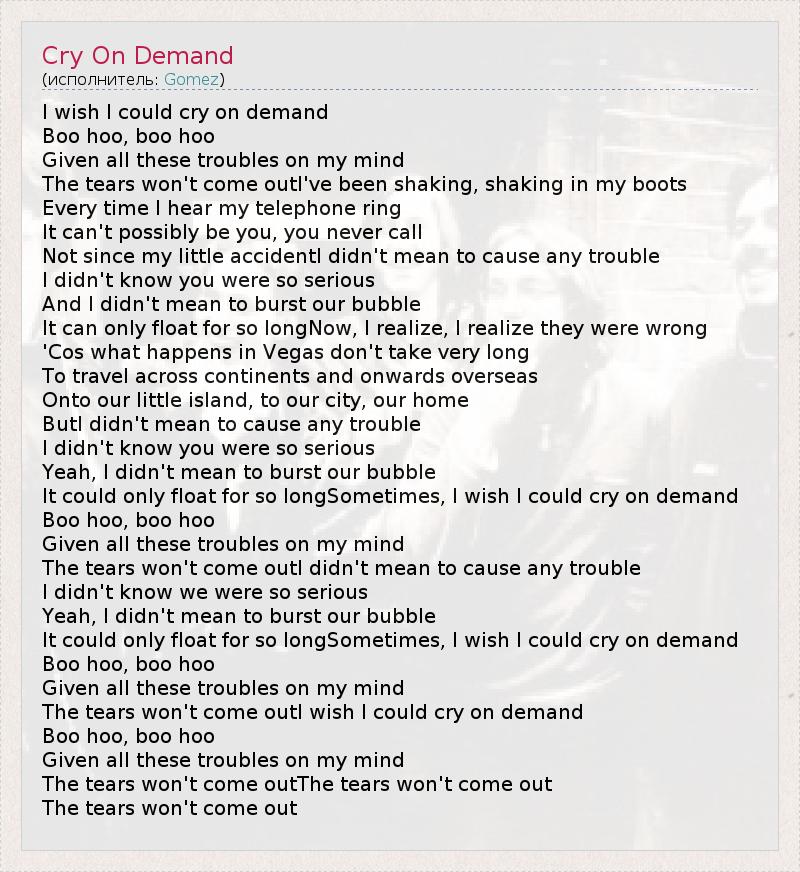 I wish I could cry on demand Boo hoo, boo hoo Given all these troubles on my mind The tears won't come outI've been shaking, shaking in my boots Every time I hear my telephone ring It can't possibly be you, you never call Not since my little accidentI didn't mean to cause any trouble I didn't know you were so serious And I didn't mean to burst our bubble It can only float for so longNow, I realize, I realize they were wrong 'Cos what happens in Vegas don't take very long To travel across continents and onwards overseas Onto our little island, to our city, our home ButI didn't mean to cause any trouble I didn't know you were so serious Yeah, I didn't mean to burst our bubble It could only float for so longSometimes, I wish I could cry on demand Boo hoo, boo hoo Given all these troubles on my mind The tears won't come outI didn't mean to cause any trouble I didn't know we were so serious Yeah, I didn't mean to burst our bubble It could only float for so longSometimes, I wish I could cry on demand Boo hoo, boo hoo Given all these troubles on my mind The tears won't come outI wish I could cry on demand Boo hoo, boo hoo Given all these troubles on my mind The tears won't come outThe tears won't come out The tears won't come out