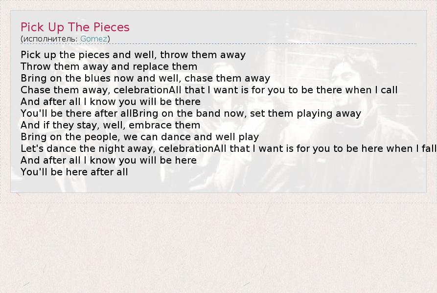 А как ты думаешь, о чем песня "Pick Up The Pieces" ?