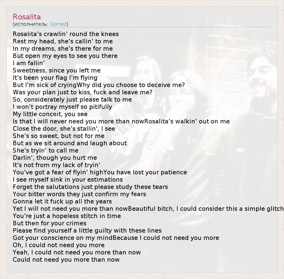 Is that I will never need you more than nowRosalita's walkin' out on me