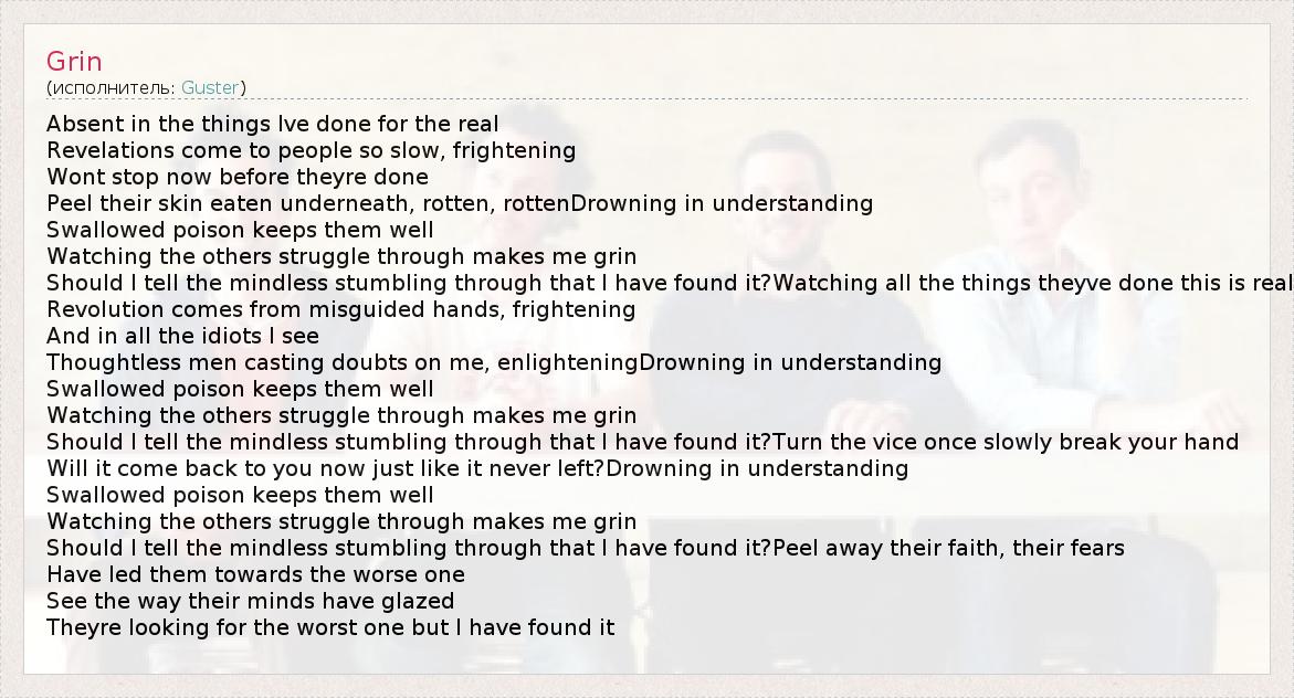 Это интересно:Guster - американская группа альтернативного рока, которая известна ее живыми концертами, юмором, и культом после. Группа сформирована Адамом Гарднером, Раяном Миллером, и Брайеном Розенуоркелем в 1991Группа осталась "подземной" для своих первых двух альбомов, "Parachute" (1994) и "Goldfly" (1997), но ворвалась в музыкальную индустрию в 1999 с ее третьим альбомом студии, "Lost and Gone Forever",... продолжение