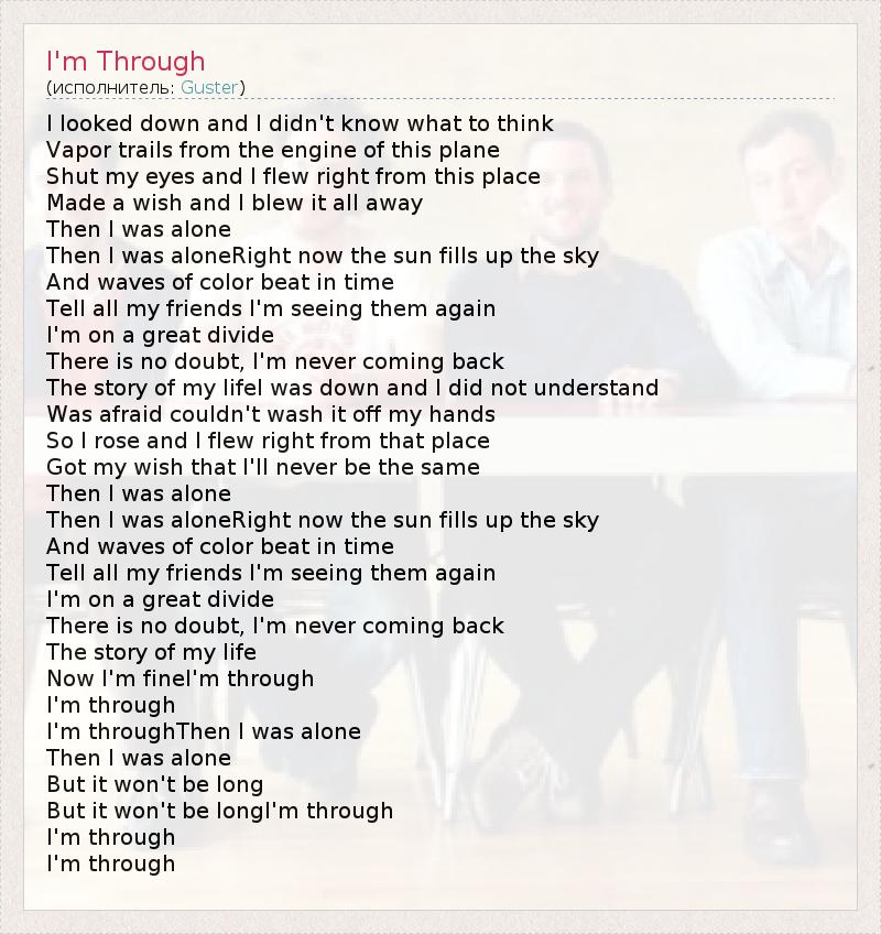I looked down and I didn't know what to think Vapor trails from the engine of this plane Shut my eyes and I flew right from this place Made a wish and I blew it all away Then I was alone Then I was aloneRight now the sun fills up the sky And waves of color beat in time Tell all my friends I'm seeing them again I'm on a great divide There is no doubt, I'm never coming back The story of my lifeI was down and I did not understand Was afraid couldn't wash it off my hands So I rose and I flew right from that place Got my wish that I'll never be the same Then I was alone Then I was aloneRight now the sun fills up the sky And waves of color beat in time Tell all my friends I'm seeing them again I'm on a great divide There is no doubt, I'm never coming back The story of my life Now I'm fineI'm through I'm through I'm throughThen I was alone Then I was alone But it won't be long But it won't be longI'm through I'm through I'm through