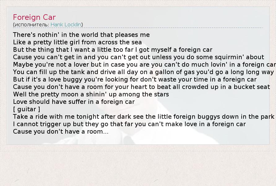 There's nothin' in the world that pleases me Like a pretty little girl from across the sea But the thing that I want a little too far I got myself a foreign car Cause you can't get in and you can't get out unless you do some squirmin' about Maybe you're not a lover but in case you are you can't do much lovin' in a foreign car You can fill up the tank and drive all day on a gallon of gas you'd go a long long way But if it's a love buggy you're looking for don't waste your time in a foreign car Cause you don't have a room for your heart to beat all crowded up in a bucket seat Well the pretty moon a shinin' up among the stars Love should have suffer in a foreign car [ guitar ] Take a ride with me tonight after dark see the little foreign buggys down in the park I cannot trigger up but they go that far you can't make love in a foreign car Cause you don't have a room...