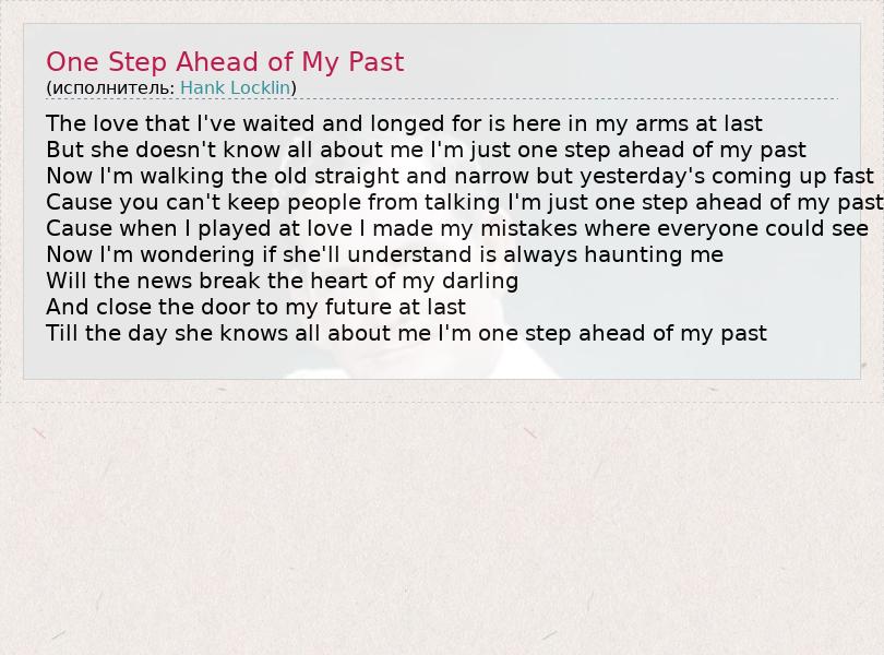 The love that I've waited and longed for is here in my arms at last But she doesn't know all about me I'm just one step ahead of my past Now I'm walking the old straight and narrow but yesterday's coming up fast Cause you can't keep people from talking I'm just one step ahead of my past Cause when I played at love I made my mistakes where everyone could see Now I'm wondering if she'll understand is always haunting me Will the news break the heart of my darling And close the door to my future at last Till the day she knows all about me I'm one step ahead of my past