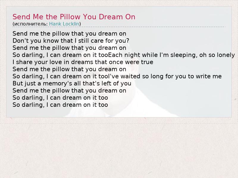 Send me the pillow that you dream on Don't you know that I still care for you? Send me the pillow that you dream on So darling, I can dream on it tooEach night while I'm sleeping, oh so lonely I share your love in dreams that once were true Send me the pillow that you dream on So darling, I can dream on it tooI've waited so long for you to write me But just a memory's all that's left of you Send me the pillow that you dream on So darling, I can dream on it too So darling, I can dream on it too