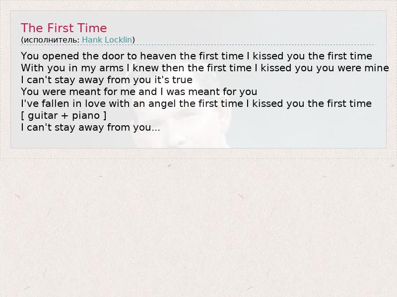 You opened the door to heaven the first time I kissed you the first time With you in my arms I knew then the first time I kissed you you were mine I can't stay away from you it's true You were meant for me and I was meant for you I've fallen in love with an angel the first time I kissed you the first time [ guitar + piano ] I can't stay away from you...