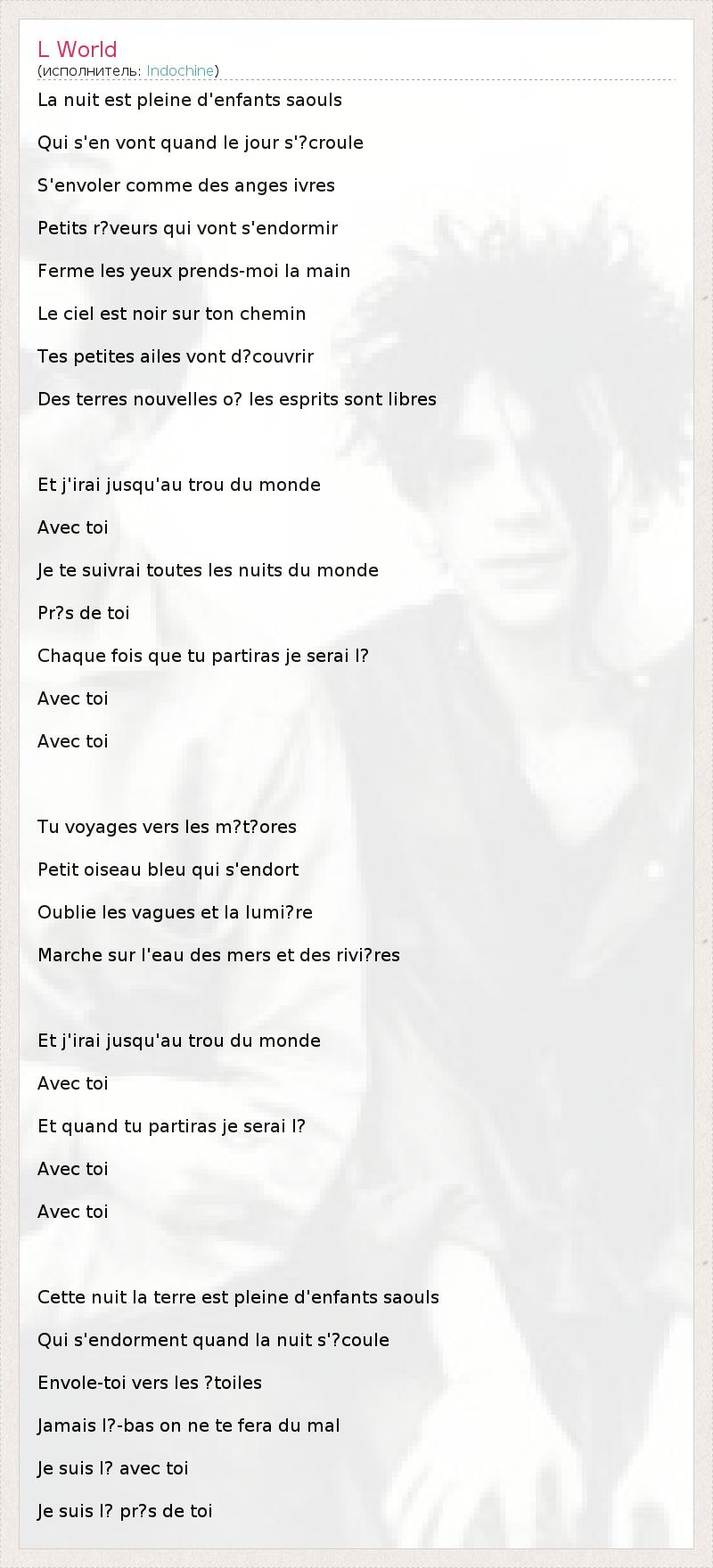 Это интересно:Indochine ("Эндощин", однако многим русскоязычным поклонникам удобнее говорить "Индошин", а для краткости принято просто "Индо" и это имя группы самое интернациональное)Родина: Париж, ФранцияЖанры: New wave, Glam rock и Gothique, pop rockСуществует с 1981 Лейблы:BMG (Ariola), Epic, Jivepic Group Официальные сайт: indo.frНынешние участники:Николя Сиркис (Nicola Sirkis) (вокал, гитара, синтез и гармоника,... продолжение