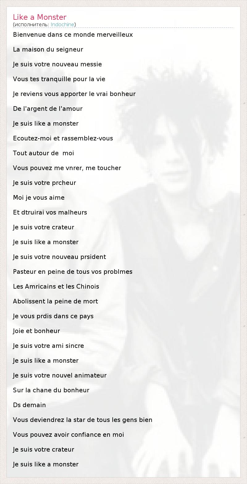 Bienvenue dans ce monde merveilleux La maison du seigneur Je suis votre nouveau messie Vous tes tranquille pour la vie Je reviens vous apporter le vrai bonheur De l'argent de l'amour Je suis like a monster Ecoutez-moi et rassemblez-vous Tout autour de moi Vous pouvez me vnrer, me toucher Je suis votre prcheur Moi je vous aime Et dtruirai vos malheurs Je suis votre crateur Je suis like a monster Je suis votre nouveau prsident Pasteur en peine de tous vos problmes Les Amricains et les Chinois Abolissent la peine de mort Je vous prdis dans ce pays Joie et bonheur Je suis votre ami sincre Je suis like a monster Je suis votre nouvel animateur Sur la chane du bonheur Ds demain Vous deviendrez la star de tous les gens bien Vous pouvez avoir confiance en moi Je suis votre crateur Je suis like a monster