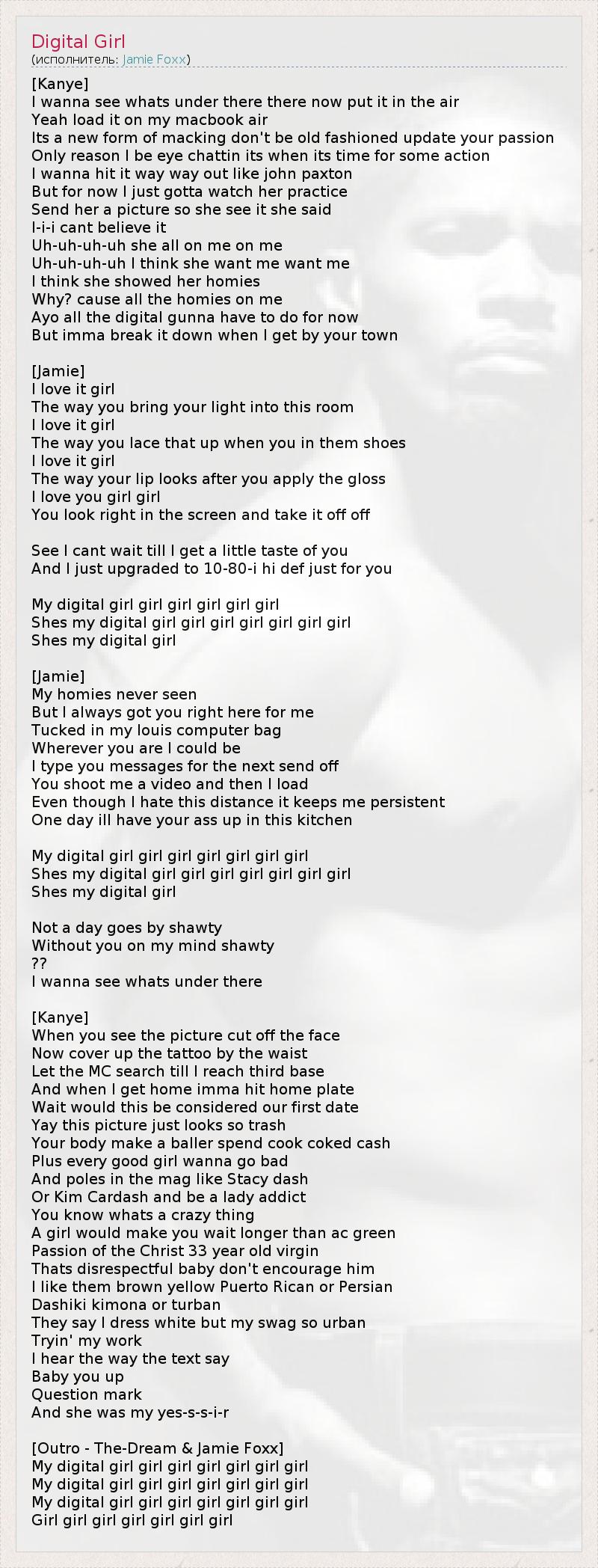 [Kanye] I wanna see whats under there there now put it in the air Yeah load it on my macbook air Its a new form of macking don't be old fashioned update your passion Only reason I be eye chattin its when its time for some action I wanna hit it way way out like john paxton But for now I just gotta watch her practice Send her a picture so she see it she said I-i-i cant believe it Uh-uh-uh-uh she all on me on me Uh-uh-uh-uh I think she want me want me I think she showed her homies Why? cause all the homies on me Ayo all the digital gunna have to do for now But imma break it down when I get by your town [Jamie] I love it girl The way you bring your light into this room I love it girl The way you lace that up when you in them shoes I love it girl The way your lip looks after you apply the gloss I love you girl girl You look right in the screen and take it off off See I cant wait till I get a little taste of you And I just upgraded to 10-80-i hi def just for you My digital girl girl girl girl girl girl Shes my digital girl girl girl girl girl girl girl Shes my digital girl [Jamie] My homies never seen But I always got you right here for me Tucked in my louis computer bag Wherever you are I could be I type you messages for the next send off You shoot me a video and then I load Even though I hate this distance it keeps me persistent One day ill have your ass up in this kitchen My digital girl girl girl girl girl girl girl Shes my digital girl girl girl girl girl girl girl Shes my digital girl Not a day goes by shawty Without you on my mind shawty ?? I wanna see whats under there [Kanye] When you see the picture cut off the face Now cover up the tattoo by the waist Let the MC search till I reach third base And when I get home imma hit home plate Wait would this be considered our first date Yay this picture just looks so trash Your body make a baller spend cook coked cash Plus every good girl wanna go bad And poles in the mag like Stacy dash Or Kim Cardash and be a lady addict You know whats a crazy thing A girl would make you wait longer than ac green Passion of the Christ 33 year old virgin Thats disrespectful baby don't encourage him I like them brown yellow Puerto Rican or Persian Dashiki kimona or turban They say I dress white but my swag so urban Tryin' my work I hear the way the text say Baby you up Question mark And she was my yes-s-s-i-r [Outro - The-Dream & Jamie Foxx] My digital girl girl girl girl girl girl girl My digital girl girl girl girl girl girl girl My digital girl girl girl girl girl girl girl Girl girl girl girl girl girl girl