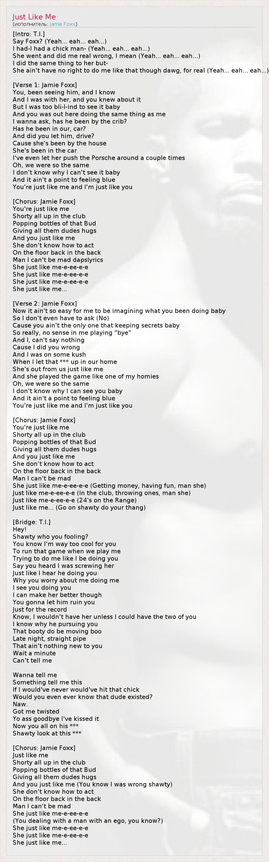 [Intro: T.I.] Say Foxx? (Yeah... eah... eah...) I had-I had a chick man- (Yeah... eah... eah...) She went and did me real wrong, I mean (Yeah... eah... eah...) I did the same thing to her but- She ain't have no right to do me like that though dawg, for real (Yeah... eah... eah...) [Verse 1: Jamie Foxx] You, been seeing him, and I know And I was with her, and you knew about it But I was too bli-I-ind to see it baby And you was out here doing the same thing as me I wanna ask, has he been by the crib? Has he been in our, car? And did you let him, drive? Cause she's been by the house She's been in the car I've even let her push the Porsche around a couple times Oh, we were so the same I don't know why I can't see it baby And it ain't a point to feeling blue You're just like me and I'm just like you [Chorus: Jamie Foxx] You're just like me Shorty all up in the club Popping bottles of that Bud Giving all them dudes hugs And you just like me She don't know how to act On the floor back in the back Man I can't be mad dapslyrics She just like me-e-ee-e-e She just like me-e-ee-e-e She just like me-e-ee-e-e She just like me... [Verse 2: Jamie Foxx] Now it ain't so easy for me to be imagining what you been doing baby So I don't even have to ask (No) Cause you ain't the only one that keeping secrets baby So really, no sense in me playing "bye" And I, can't say nothing Cause I did you wrong And I was on some kush When I let that *** up in our home She's out from us just like me And she played the game like one of my homies Oh, we were so the same I don't know why I can see you baby And it ain't a point to feeling blue You're just like me and I'm just like you [Chorus: Jamie Foxx] You're just like me Shorty all up in the club Popping bottles of that Bud Giving all them dudes hugs And you just like me She don't know how to act On the floor back in the back Man I can't be mad She just like me-e-ee-e-e (Getting money, having fun, man she) Just like me-e-ee-e-e (In the club, throwing ones, man she) Just like me-e-ee-e-e (24's on the Range) Just like me... (Go on shawty do your thang) [Bridge: T.I.] Hey! Shawty who you fooling? You know I'm way too cool for you To run that game when we play me Trying to do me like I be doing you Say you heard I was screwing her Just like I hear he doing you Why you worry about me doing me I see you doing you I can make her better though You gonna let him ruin you Just for the record Know, I wouldn't have her unless I could have the two of you I know why he pursuing you That booty do be moving boo Late night, straight pipe That ain't nothing new to you Wait a minute Can't tell me Wanna tell me Something tell me this If I would've never would've hit that chick Would you even ever know that dude existed? Naw. Got me twisted Yo ass goodbye I've kissed it Now you all on his *** Shawty look at this *** [Chorus: Jamie Foxx] Just like me Shorty all up in the club Popping bottles of that Bud Giving all them dudes hugs And you just like me (You know I was wrong shawty) She don't know how to act On the floor back in the back Man I can't be mad She just like me-e-ee-e-e (You dealing with a man with an ego, you know?) She just like me-e-ee-e-e She just like me-e-ee-e-e She just like me...
