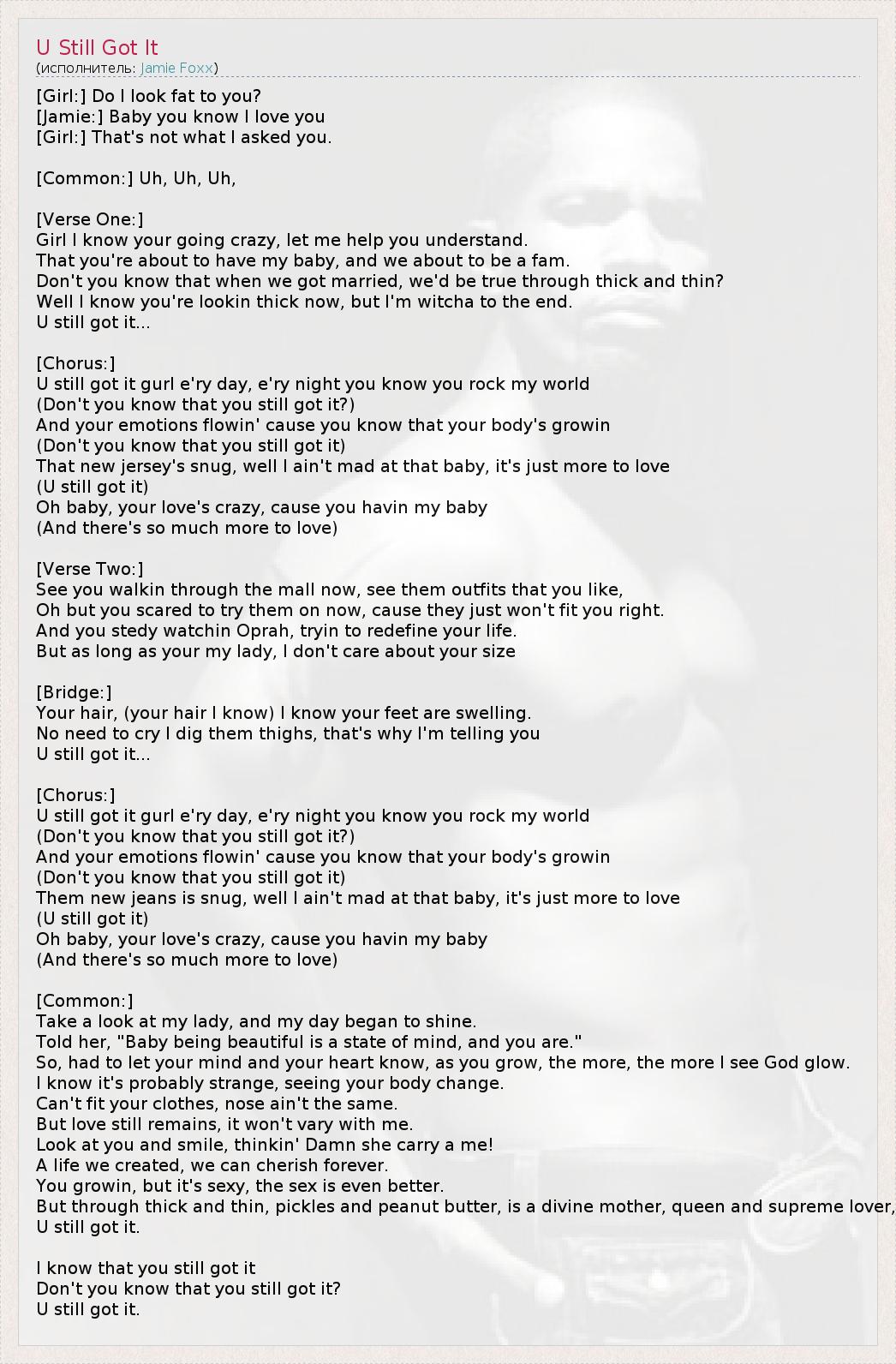 [Girl:] Do I look fat to you? [Jamie:] Baby you know I love you [Girl:] That's not what I asked you. [Common:] Uh, Uh, Uh, [Verse One:] Girl I know your going crazy, let me help you understand. That you're about to have my baby, and we about to be a fam. Don't you know that when we got married, we'd be true through thick and thin? Well I know you're lookin thick now, but I'm witcha to the end. U still got it... [Chorus:] U still got it gurl e'ry day, e'ry night you know you rock my world (Don't you know that you still got it?) And your emotions flowin' cause you know that your body's growin (Don't you know that you still got it) That new jersey's snug, well I ain't mad at that baby, it's just more to love (U still got it) Oh baby, your love's crazy, cause you havin my baby (And there's so much more to love) [Verse Two:] See you walkin through the mall now, see them outfits that you like, Oh but you scared to try them on now, cause they just won't fit you right. And you stedy watchin Oprah, tryin to redefine your life. But as long as your my lady, I don't care about your size [Bridge:] Your hair, (your hair I know) I know your feet are swelling. No need to cry I dig them thighs, that's why I'm telling you U still got it... [Chorus:] U still got it gurl e'ry day, e'ry night you know you rock my world (Don't you know that you still got it?) And your emotions flowin' cause you know that your body's growin (Don't you know that you still got it) Them new jeans is snug, well I ain't mad at that baby, it's just more to love (U still got it) Oh baby, your love's crazy, cause you havin my baby (And there's so much more to love) [Common:] Take a look at my lady, and my day began to shine. Told her, "Baby being beautiful is a state of mind, and you are." So, had to let your mind and your heart know, as you grow, the more, the more I see God glow. I know it's probably strange, seeing your body change. Can't fit your clothes, nose ain't the same. But love still remains, it won't vary with me. Look at you and smile, thinkin' Damn she carry a me! A life we created, we can cherish forever. You growin, but it's sexy, the sex is even better. But through thick and thin, pickles and peanut butter, is a divine mother, queen and supreme lover, U still got it. I know that you still got it Don't you know that you still got it? U still got it.